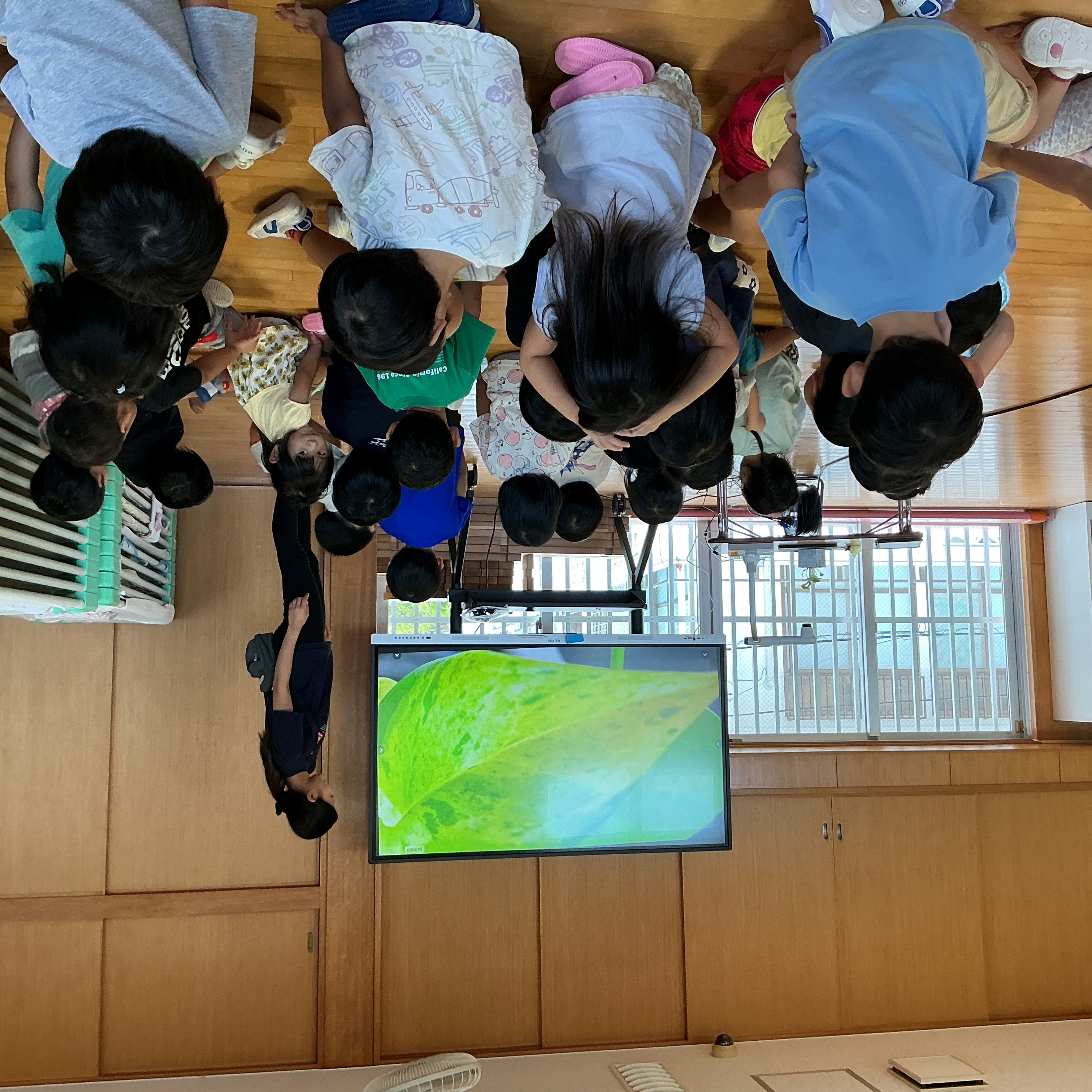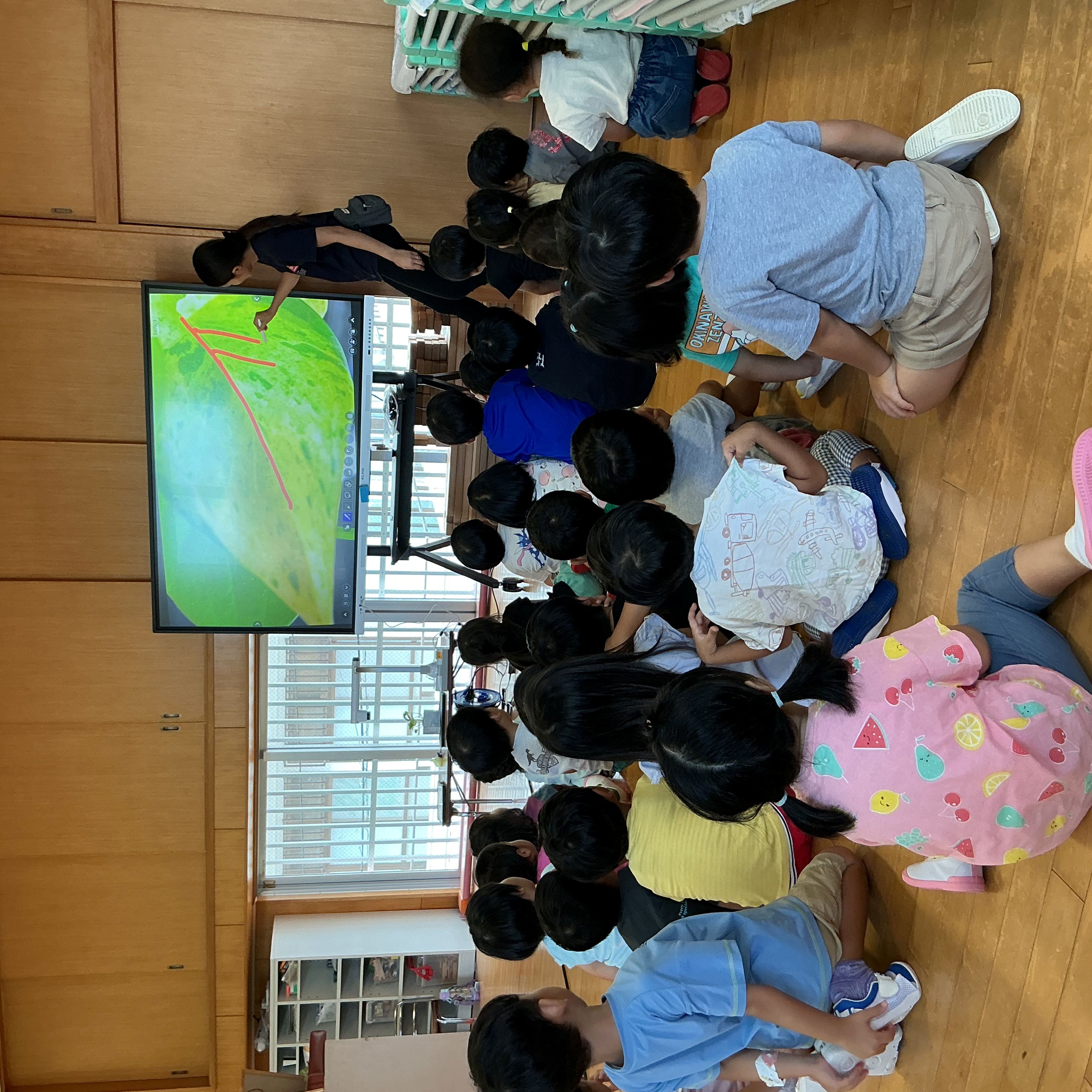 保育教材として、電子黒板が設置されました!小さな葉っぱや、きりん組が園庭で掴まえた小さなカエルも、大きく拡大されて映し出されると、みんな不思議そうに見いっていましたよ!