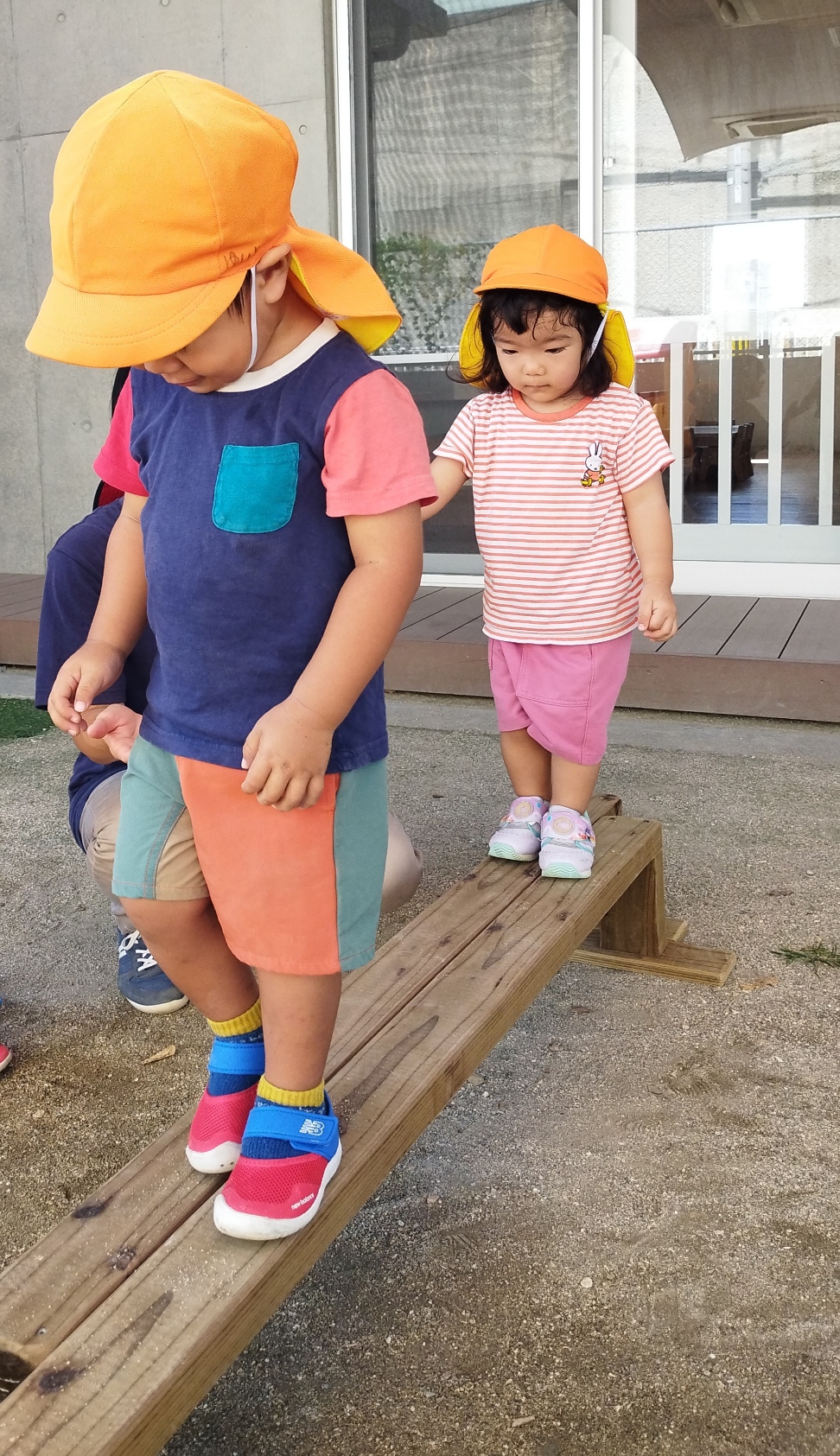 とても良い天気が続き、「今日雨降ってないからお外にいけるね♪」と毎日嬉しそうなくま組さん。最近は自分の出来る事は自分でやろうとする姿が見られ、園庭に出る時も自分たちで帽子と靴を履こうと頑張っていますよ!