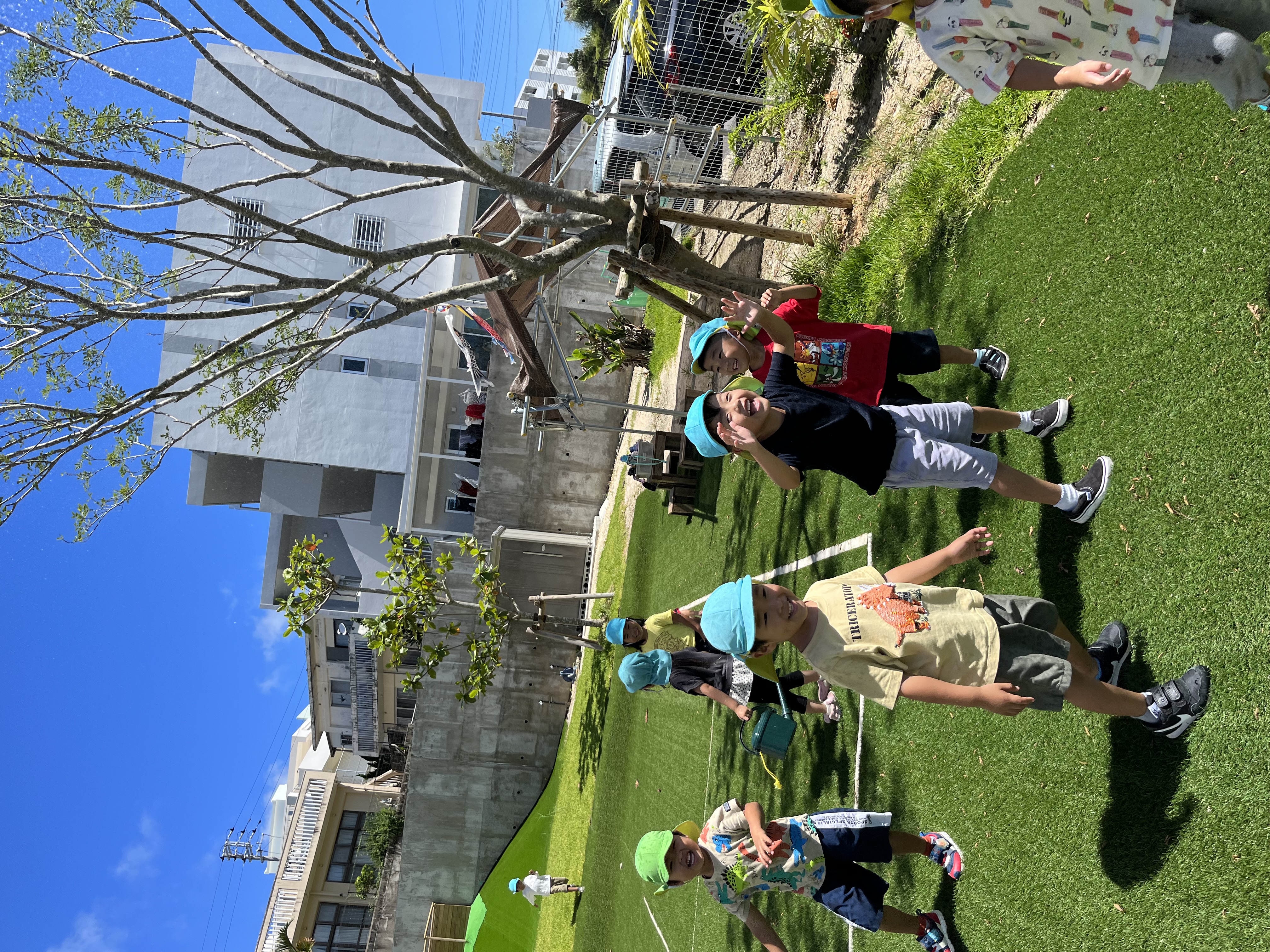 園庭に出ると早速「バッタさんいるかな?」「セミさんいるかな?」とお友達と一緒に虫かごと虫取り網を持って虫探しに出発!!