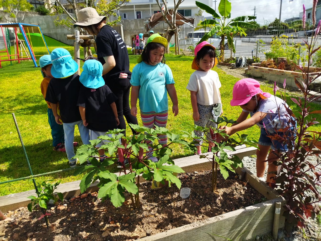 先日、第二園庭で育てているオクラを収穫しに行きました。「わー大きくなっているよ」「収穫やってみたい」と大喜びのぞう組さん。上手に収穫できました♪収穫したオクラを触ってみたり、匂いをしたりしていました。