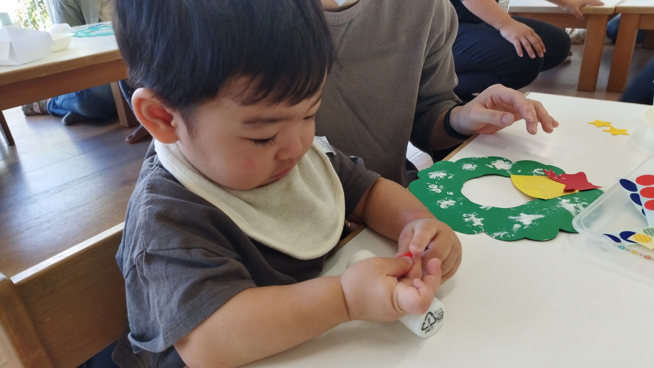 動物のカスタネット作りでは「どの動物にしようかな~?」とお母さんお父さんと一緒に選び、動物の顔のパーツを集中して貼る姿や「音が鳴ったね~」と保護者の方と喜ぶ姿にほっこりしました。