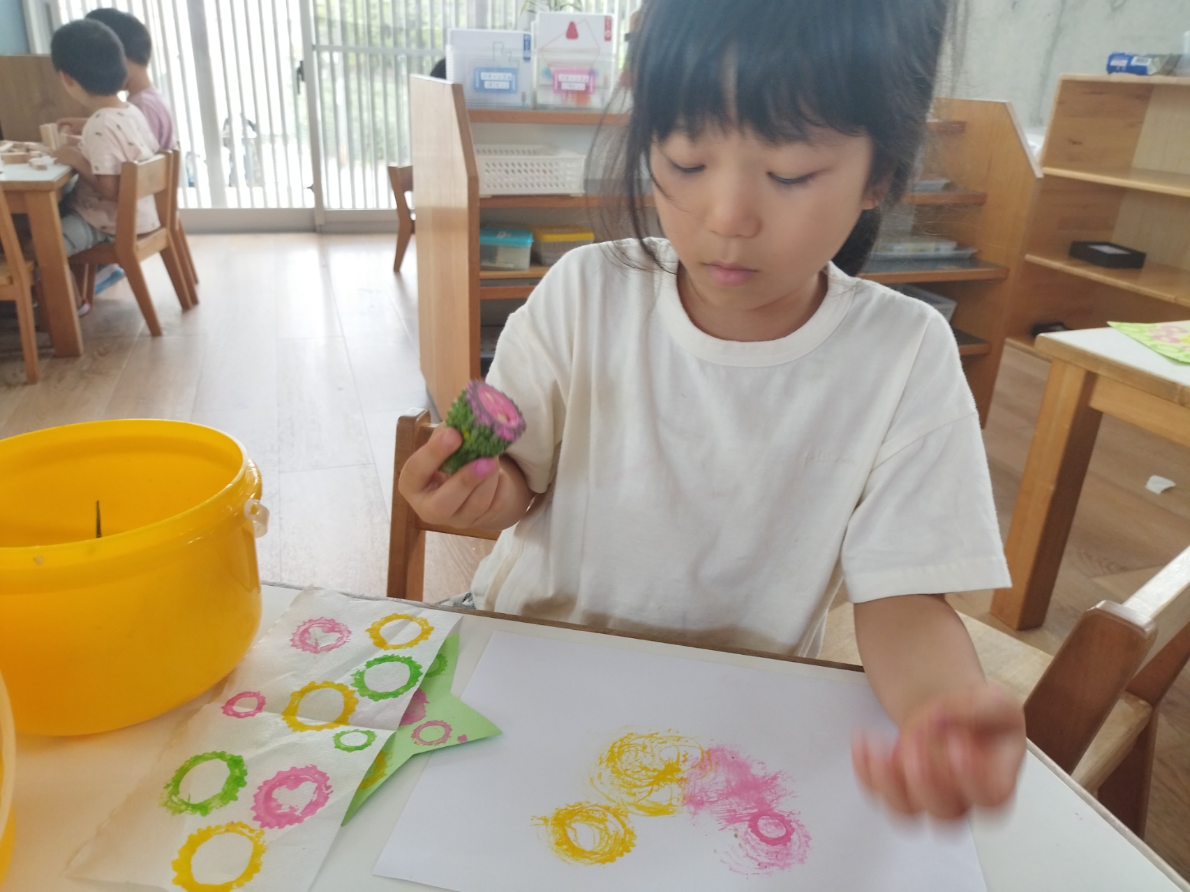 「押したらどんな形になるかな~?」とドキドキしながら実際に押してみると・・。オクラが星の形に見えたり、ゴーヤーやピーマンがが花の形になったり野菜によって形が違う事に気づき「すごーい!きれいだねー」と驚きの声が聞こえました。