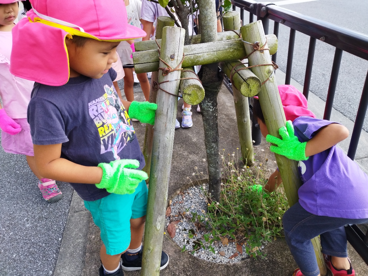 レキオスの園庭にオオゴマダラのさなぎが出来ているのを毎日観察している子ども達。「きらきら光ってきれいだね~」「いつちょうちょになるのかな?」とさなぎから羽化するのを待ちわびていました。