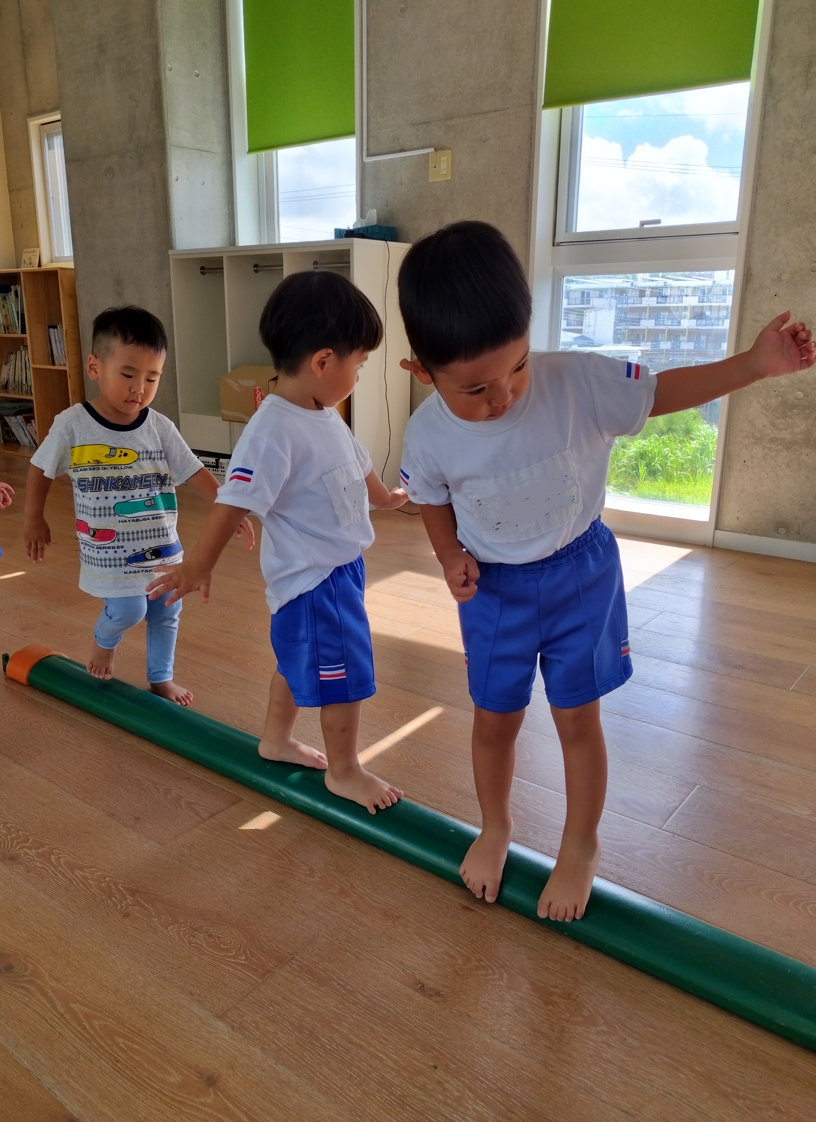 台風が過ぎ去り、ようやく雲の切れ間から空がのぞけるようになしましたね。子どもたちは変わらず元気いっぱいの姿を見せてくれていて、安心しました♪ 民舞では、「なべなべそこぬけ」を楽しみました。最後は全員で大きななべをどーん!さ~て、どこからくぐり抜けようかな?みんなで相談し合いながら話す様子に成長を感じた一コマでした♪