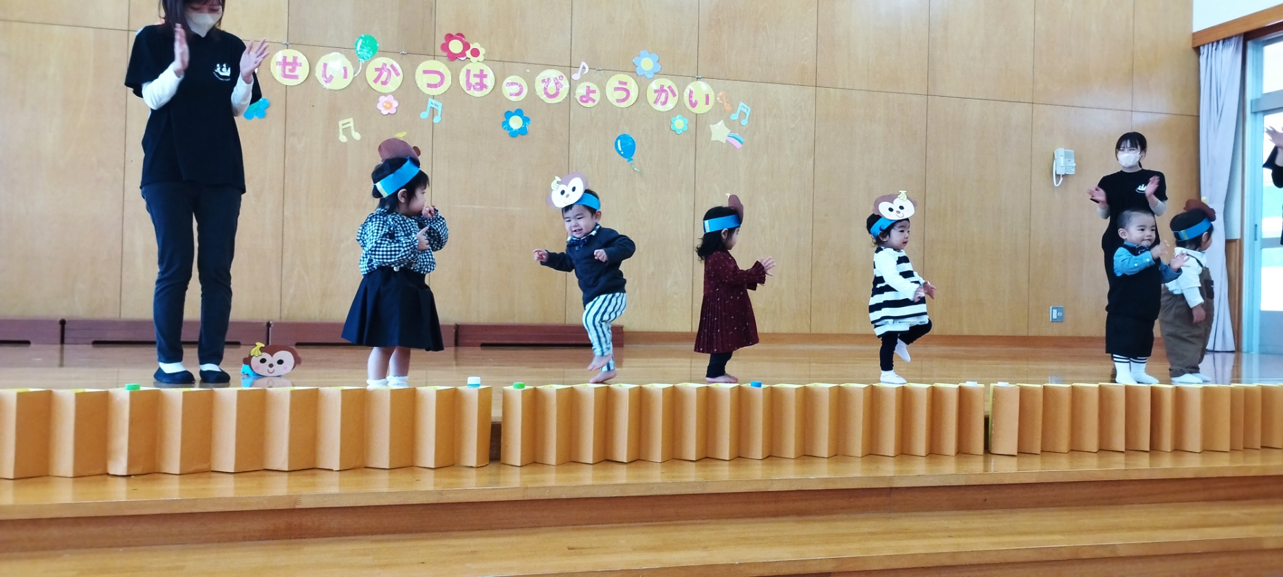ホールで集団遊びをしました!今回で2回目のイス取りゲーム♪はじめは音楽に合わせてイスの周りを歩き、音楽が止まったらイスに座る所からスタートしました。ルールが理解できるようになってきて、イスが少なくなるたびに盛り上がり楽しくできましたよ(^^♪ 悔しくて泣く姿も見られましたが、気持ちの切り替えも早くなり1,2,3位まで決まると「またやりたい!」と言う声が多かったです♪