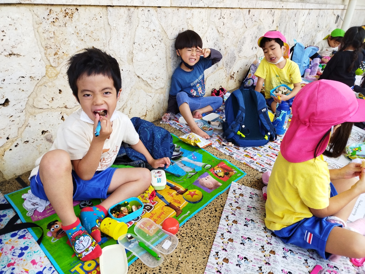 天気にも恵まれたので、ぞう組さんと一緒に園庭の木陰で食べました。