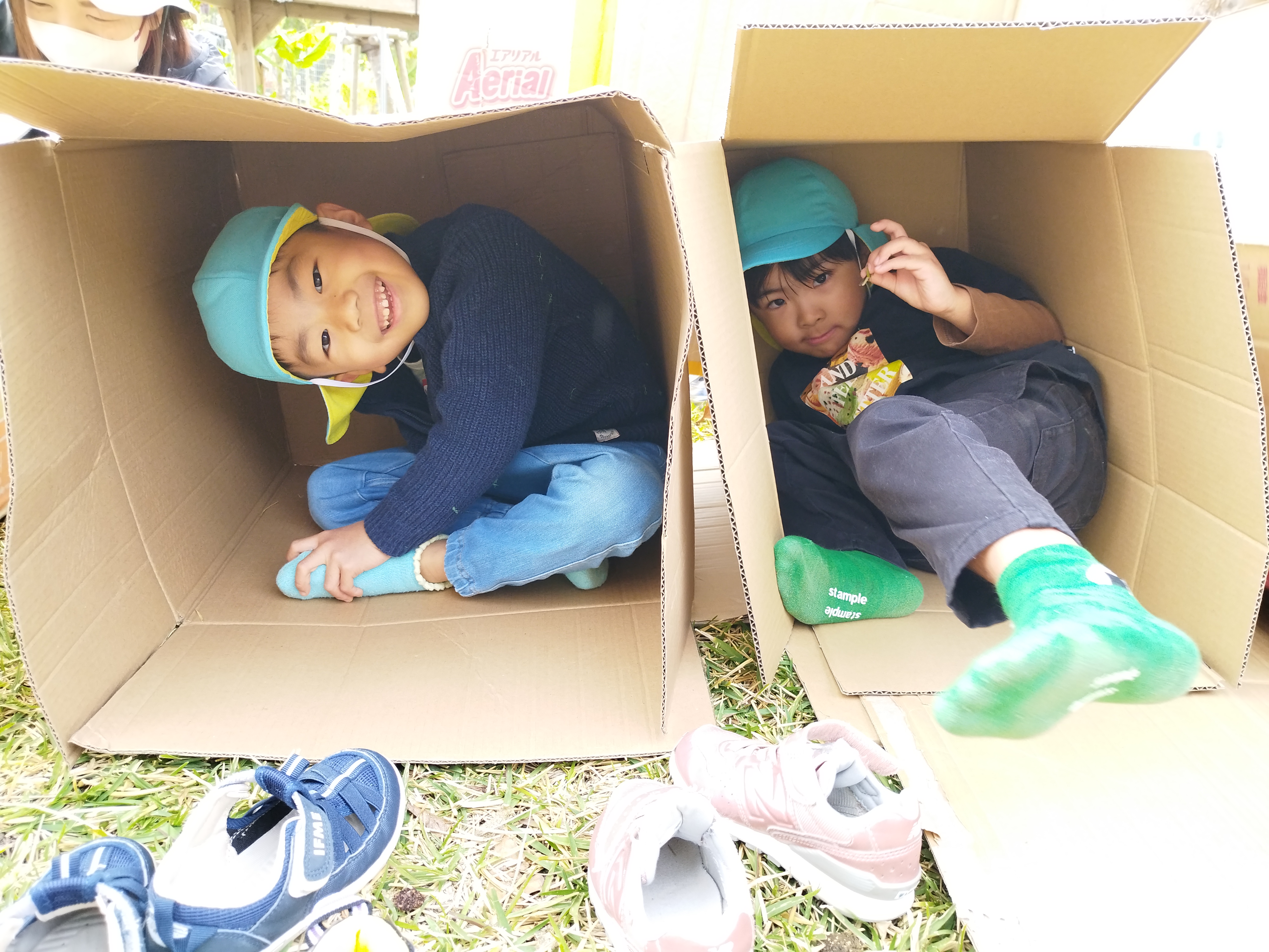 第2園庭では、ぺちゃんこにしてある段ボールを組み立ててお家を作って遊ぶことに夢中になっています。お友だちが困っていると、倒れそうな段ボールを一緒に支えてあげたり、「一緒に入ろう!」と誘ってあげたりする優しいらいおん組さんです。