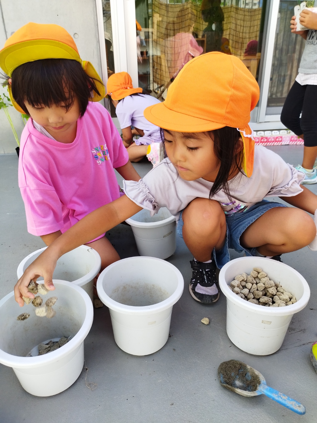 園庭遊びが大好きな子供たち。泥団子作りも自分たちでできるようになってきました。今日は数名で小さなお団子を作る子、大きなお団子を作る子、と集まって楽しそうでしたよ♪葉っぱ摘みに行く子や三輪車でツーリングなど園庭遊びを満喫しています‼