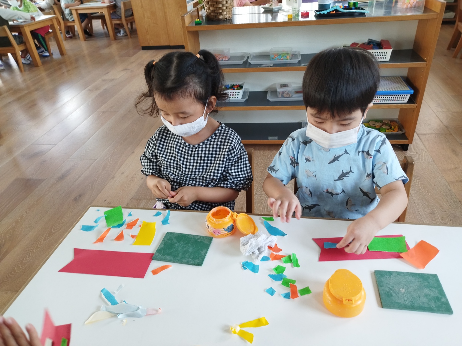 折り紙をちぎるサイズも子どもによってさまざまで、すぐに仕上げる子もいれば、時間をかけてゆっくり仕上げる子など個性豊かなあじさいの花が咲きました✿
