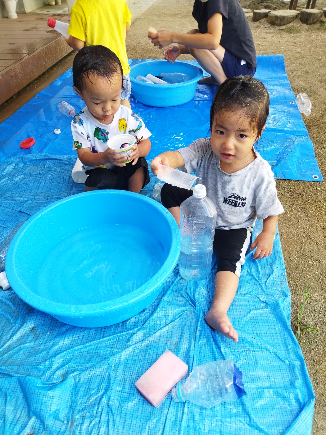 タライに入っている水に興味を持ち、積極的にカップなどを使てすくい楽しむ子ども達!