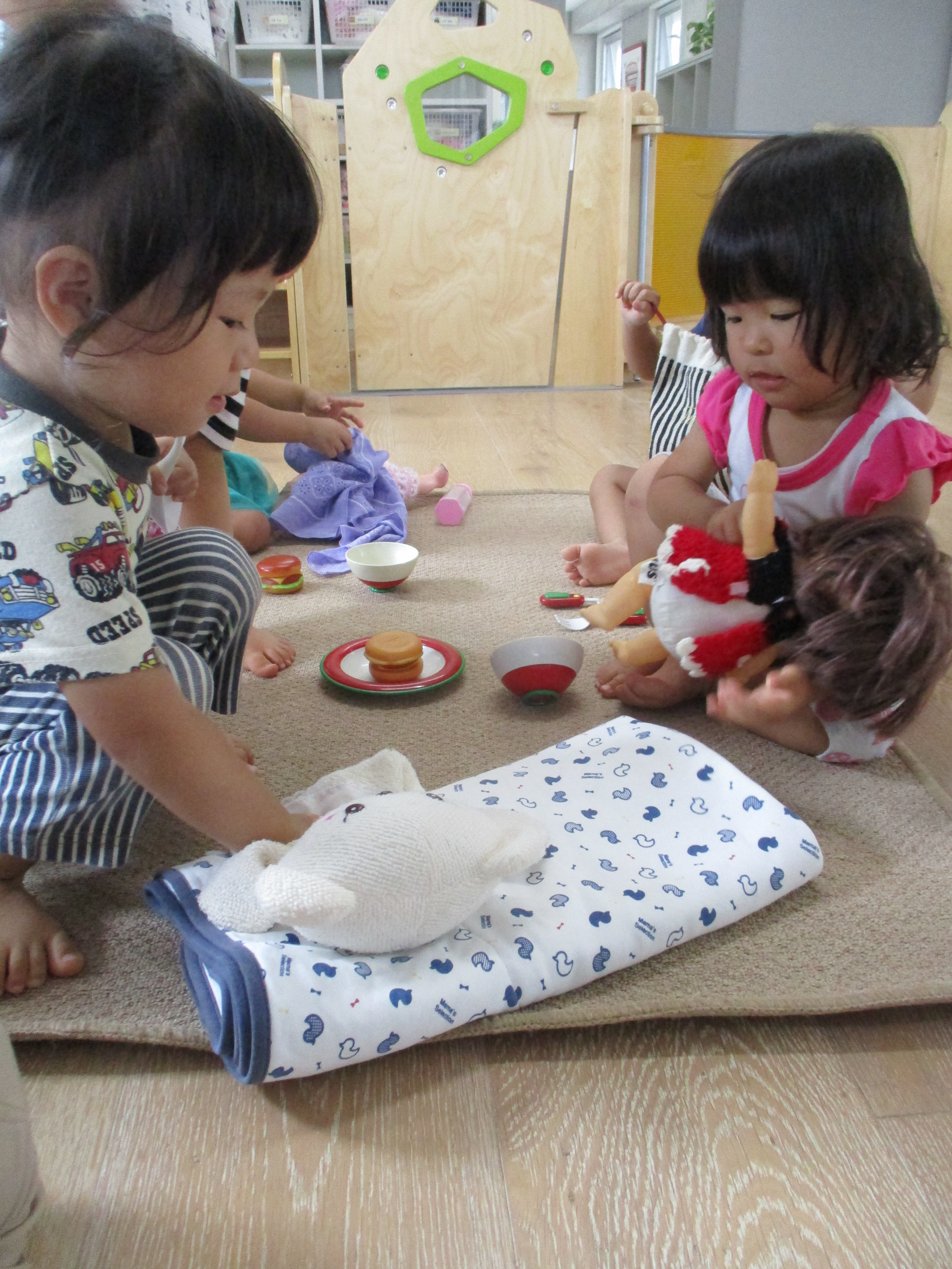 保育士が歌を歌いながら「おおかみさーん!」と呼びかけると、子ども達は「今、洋服を着ているところだよ」と皆で声を合わせて知らせます。(時々、まだご飯を食べているおおかみさんもいたりはしますが~笑)