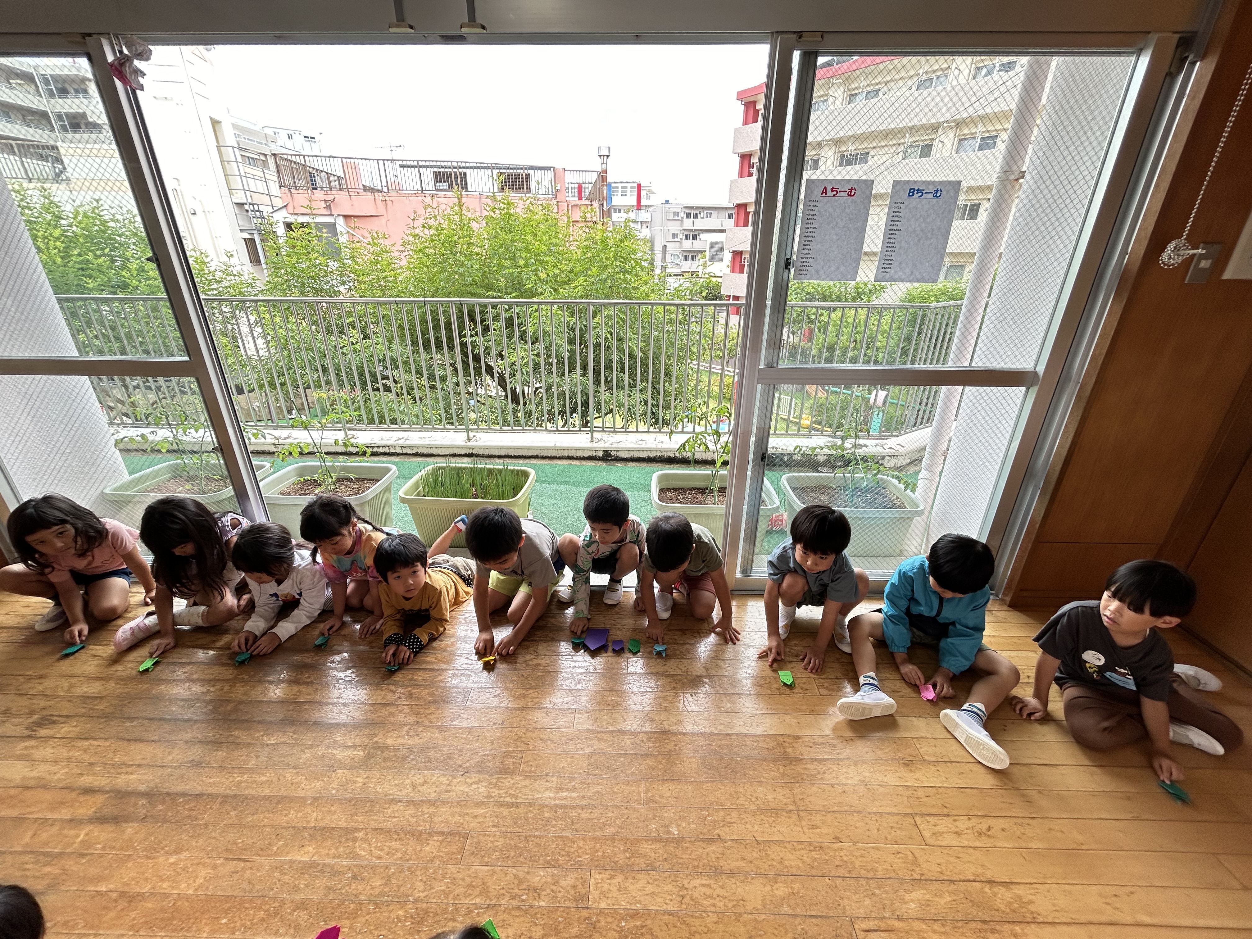 日差しが強く、暑い日が続いていますが毎日元気いっぱいの子ども達。短い間ですが影間を利用して園庭で芝生の感触を楽しんだり、しゃぼん玉遊びをしたりと楽しんでいますよ~♪