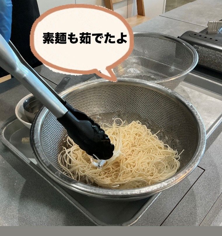 調理場さんと素麺をゆでたり、かつおだしからつゆをつくり、