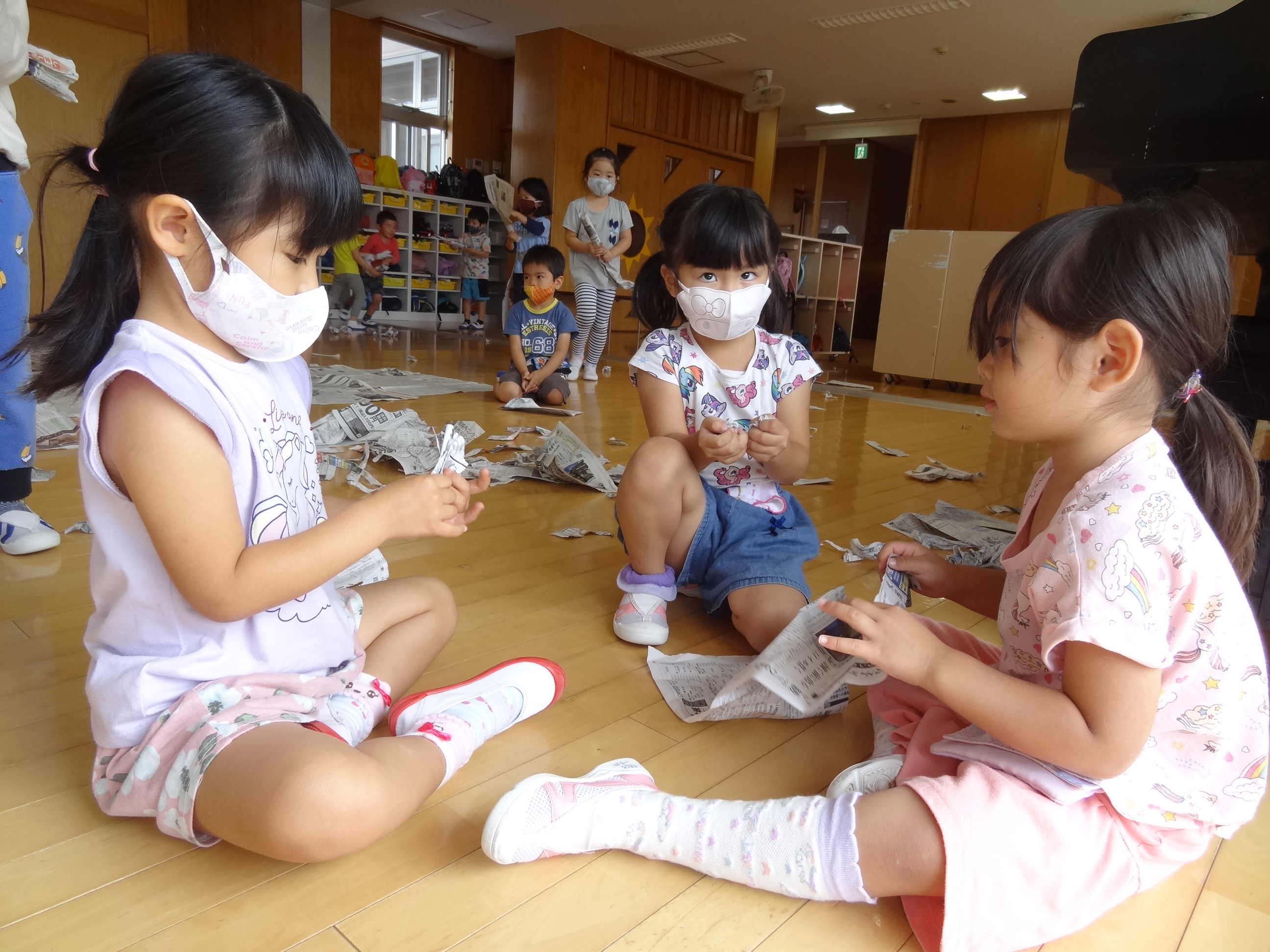 うんてい棒では、繰り返し挑戦し「最後までできた」と嬉しそうな表情に私達も元気を貰っています。ブランコでは自分達で数を数え順番を守り、「まだ乗ってない人がいいんじゃない?」と自分達で話し合う姿に成長を感じます。これから夏本番!水分補給を心掛け、楽しく過ごしていきたいと思います。