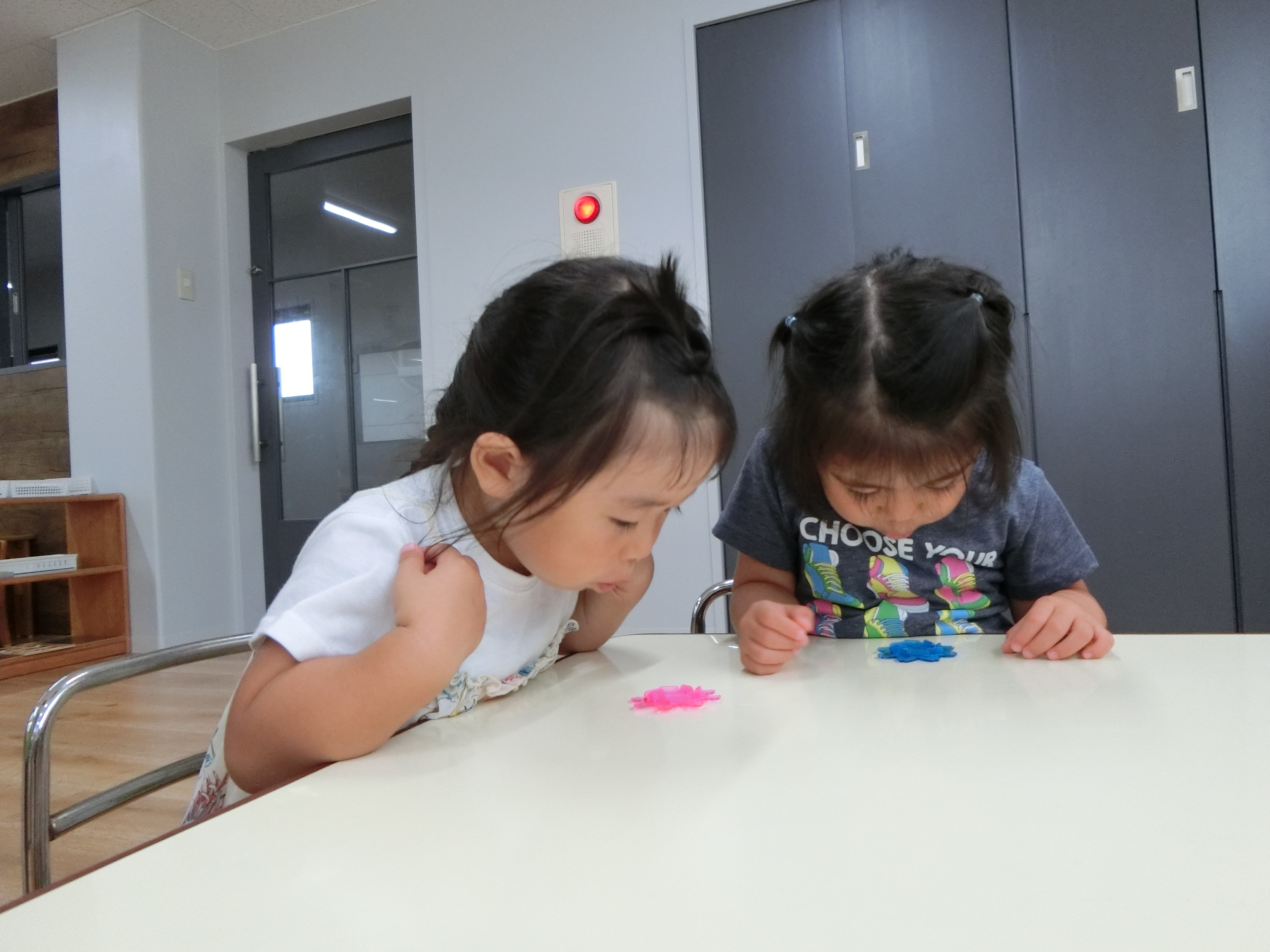 いろいろな色のカンテンを渡してみると、恐るおそるツンツン!