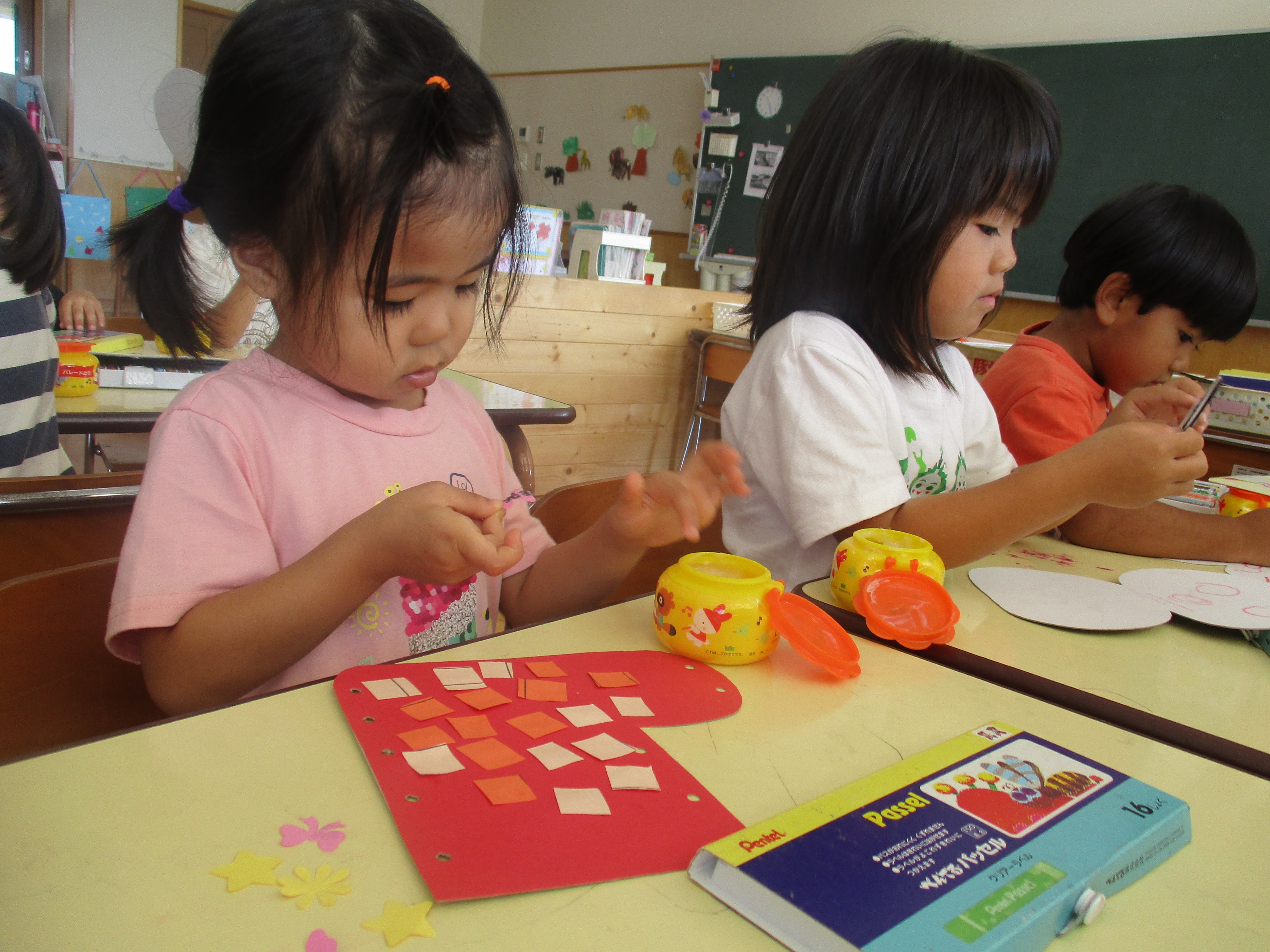 室内では、手回しごま、かるた、凧あげとう正月遊びを楽しんでいます。手回しごまでは、友達と一緒に「誰が一番長く回せるか勝負しよー」と競争を楽しんでいます。かるたでは、「せんせいー、読んで」「あ はこれ?」と友達や保育教諭とのやり取りを楽しんでいます。手作り凧あげでは、お絵かきをして園庭で飛ばすことを楽しみにしているほし組さんです。