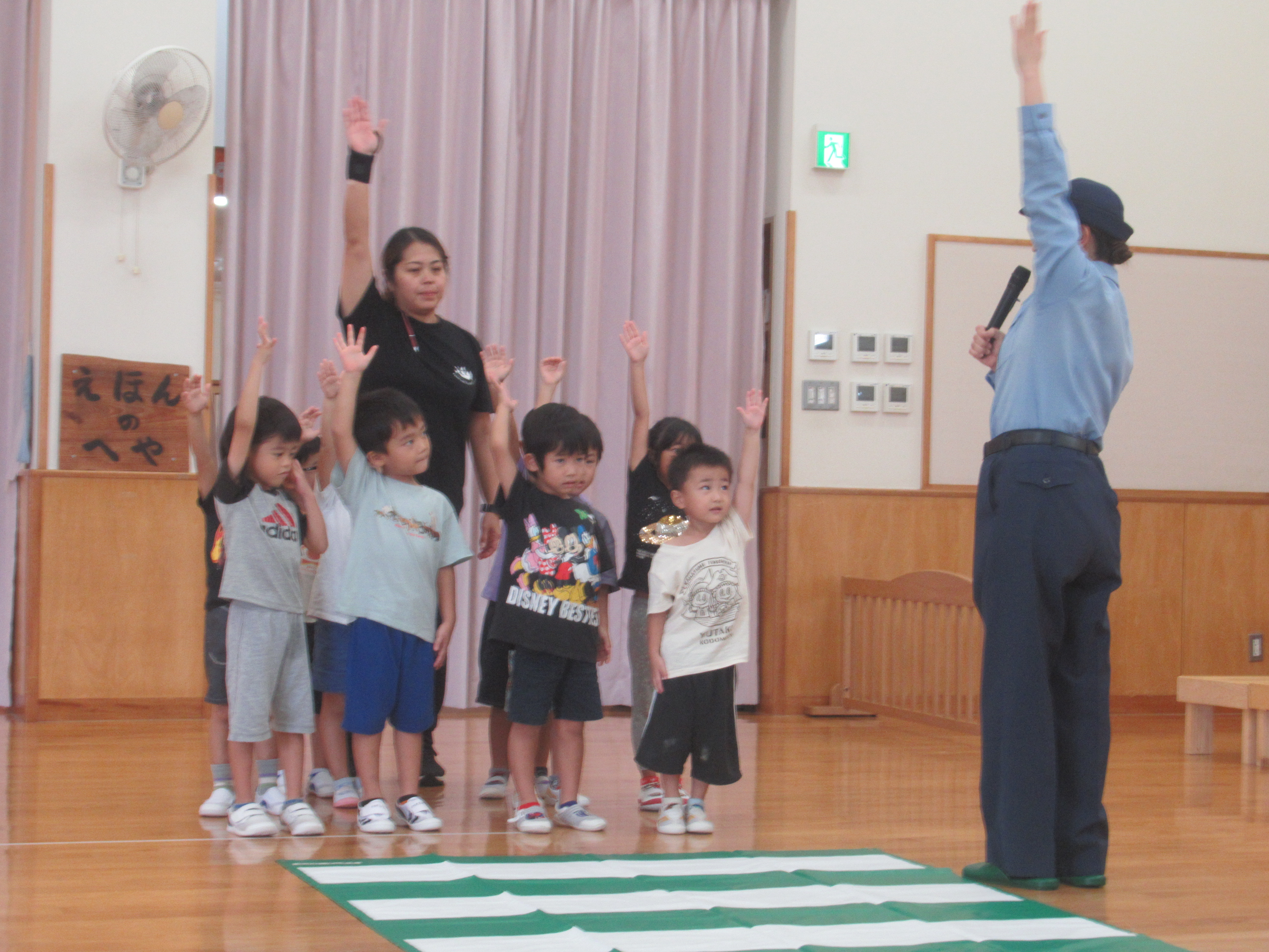 今日は豊見城市警察署の方と一緒に交通安全指導を行いました。道路・信号機の約束や横断歩道渡り方を学びました!子ども達はクイズや約束の確認を最後まで話を聞いて、実際に横断歩道の渡る練習をしましたよ!まずは、信号機を確認し右を見て左を見てまた右を見て車が来ない事を確認し手をあげて渡ることができていました!