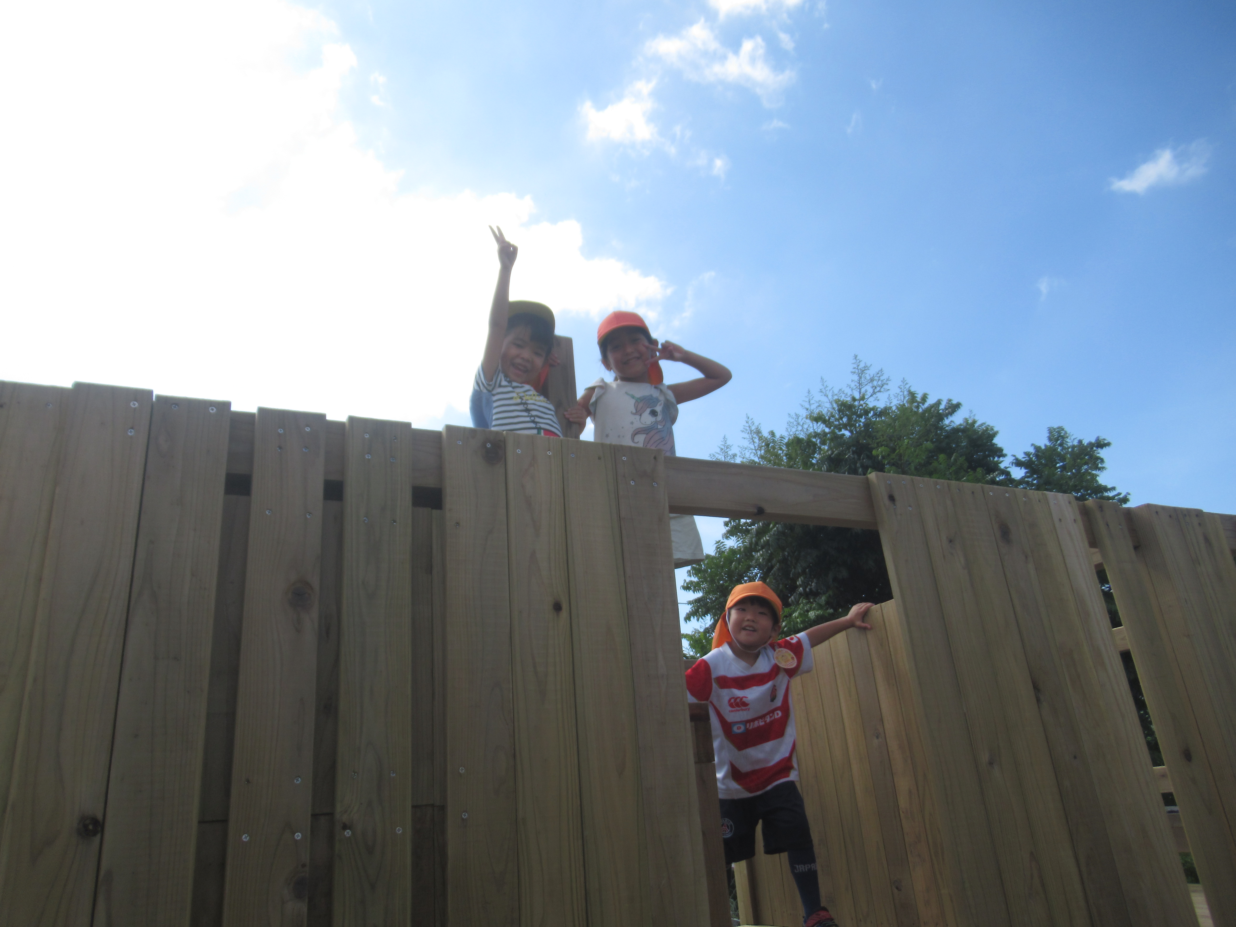 今日も元気に園庭遊びを楽しみました。ツリーハウスが大人気で、お友達がどんどん登れるのを見て``自分も頑張る‘‘と張り切ってツリーハウスに登る練習をしています。今日も初めて登れたお友達がいました。登れた時にはとても嬉しそうな表情が見られました。コツをつかんだら簡単に登れる子もいて、お友達に登り方を教える子もいました。ツリーハウスがまだ難しい子は、木登りで練習する姿も見られましたよ~。沢山練習して登れるようになろうね。 英語も元気よく歌ったり、お友達同士で「グッモーニン」の挨拶をしていました。また、来週も楽しい事沢山しようね~。