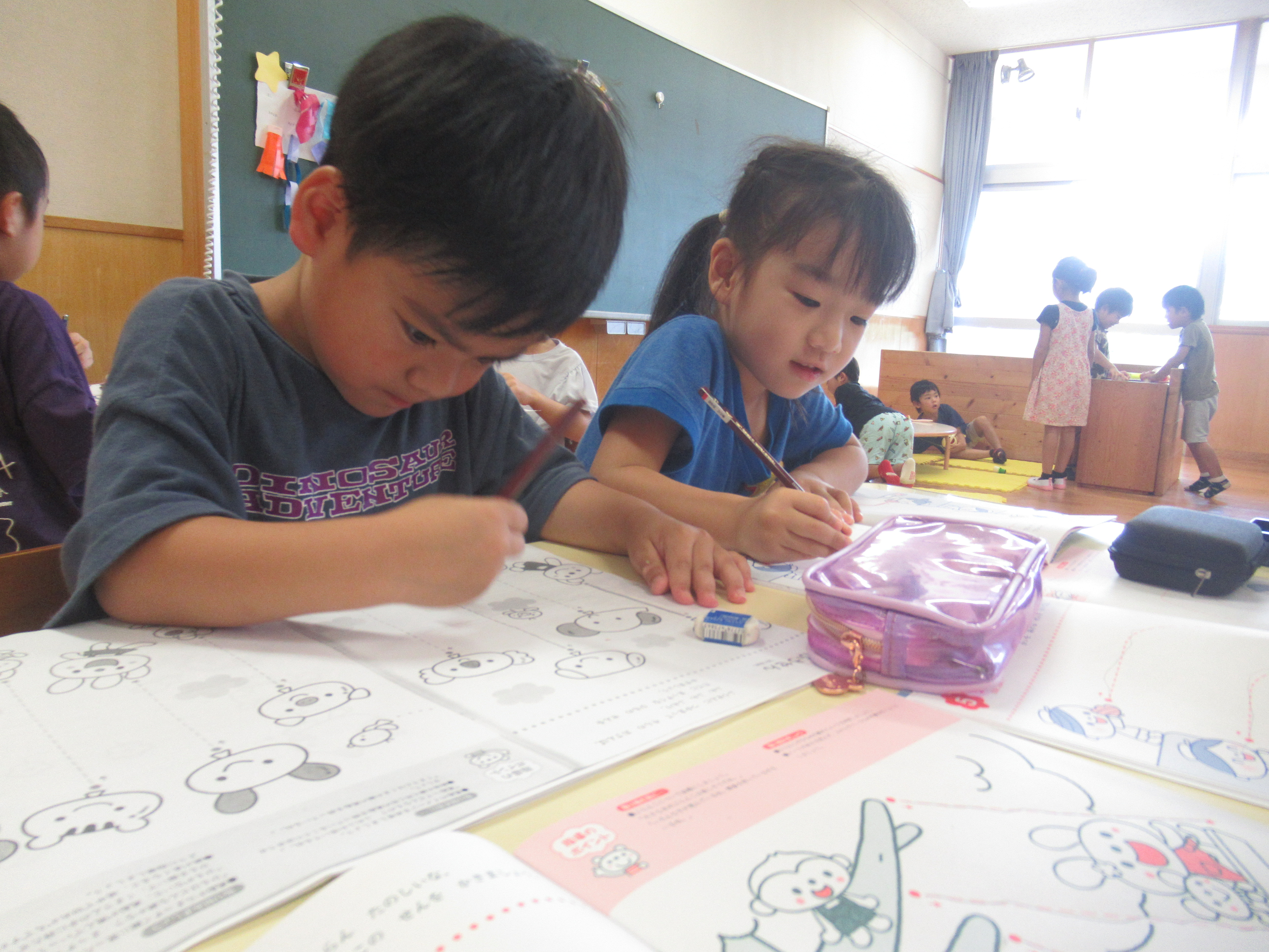 今日は、お部屋遊びと線のワークをしました。お部屋遊びでは、お絵描きを楽しんだり、おままごとでお家ごっこを楽しんでいました。お絵描きもとても上手に絵を描いたり、沢山の色を使って色塗りを楽しんでいます。 線のワークでは、正しい姿勢でしっかり三本の指で持ち、線をきれいになぞる事を意識しながら行っています。まだ、三本の指で持つ事が難しい子も、一度教えるとしっかり持つことができます。繰り返し持ち方の声掛けをしながら、自分でも意識をして持てるようにしていきたいです。全部終わったら色塗りもしようね~。