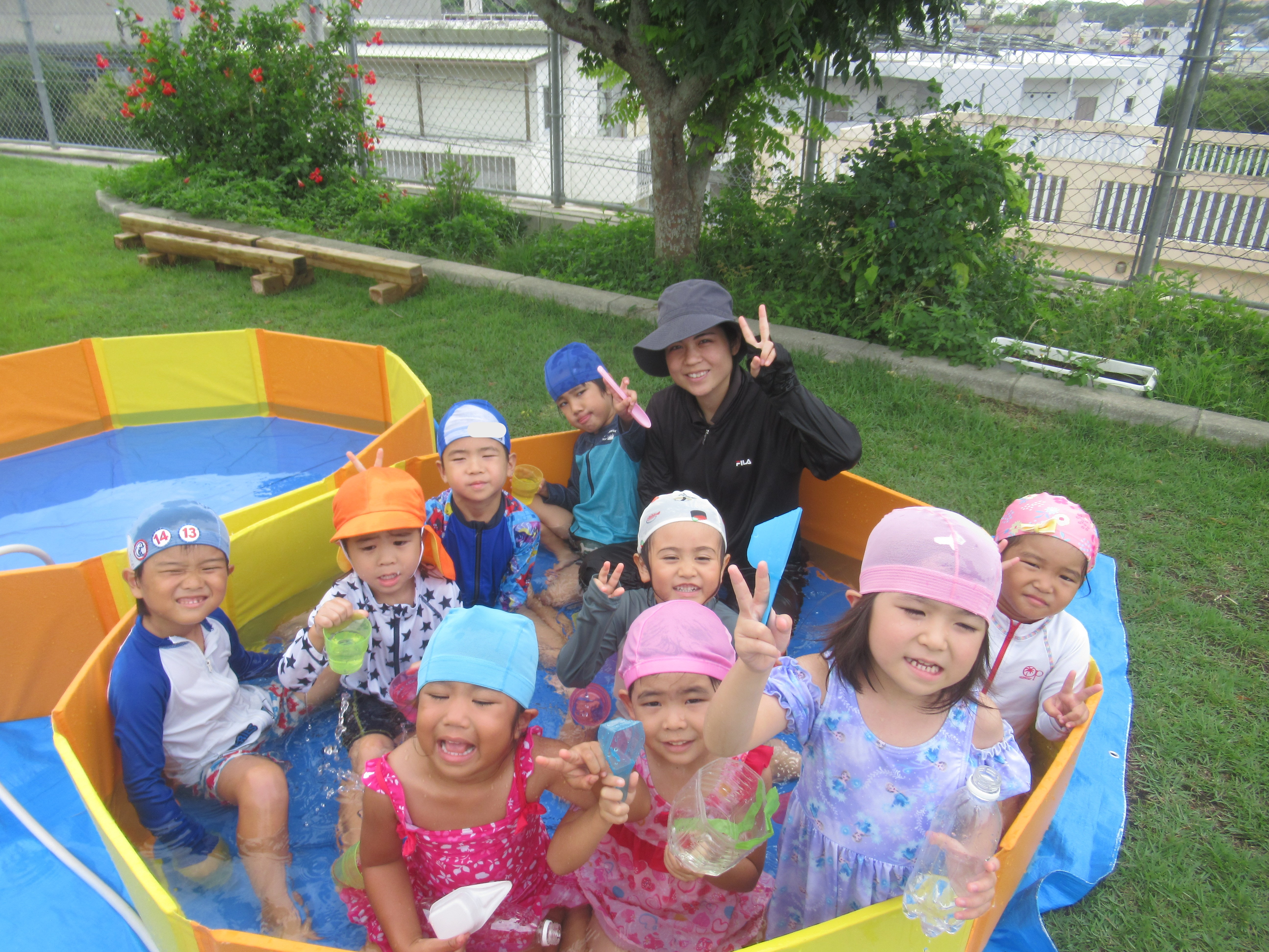 水鉄砲やパタパタプール・シャボン玉をお友達や保育教諭と楽しんでいました