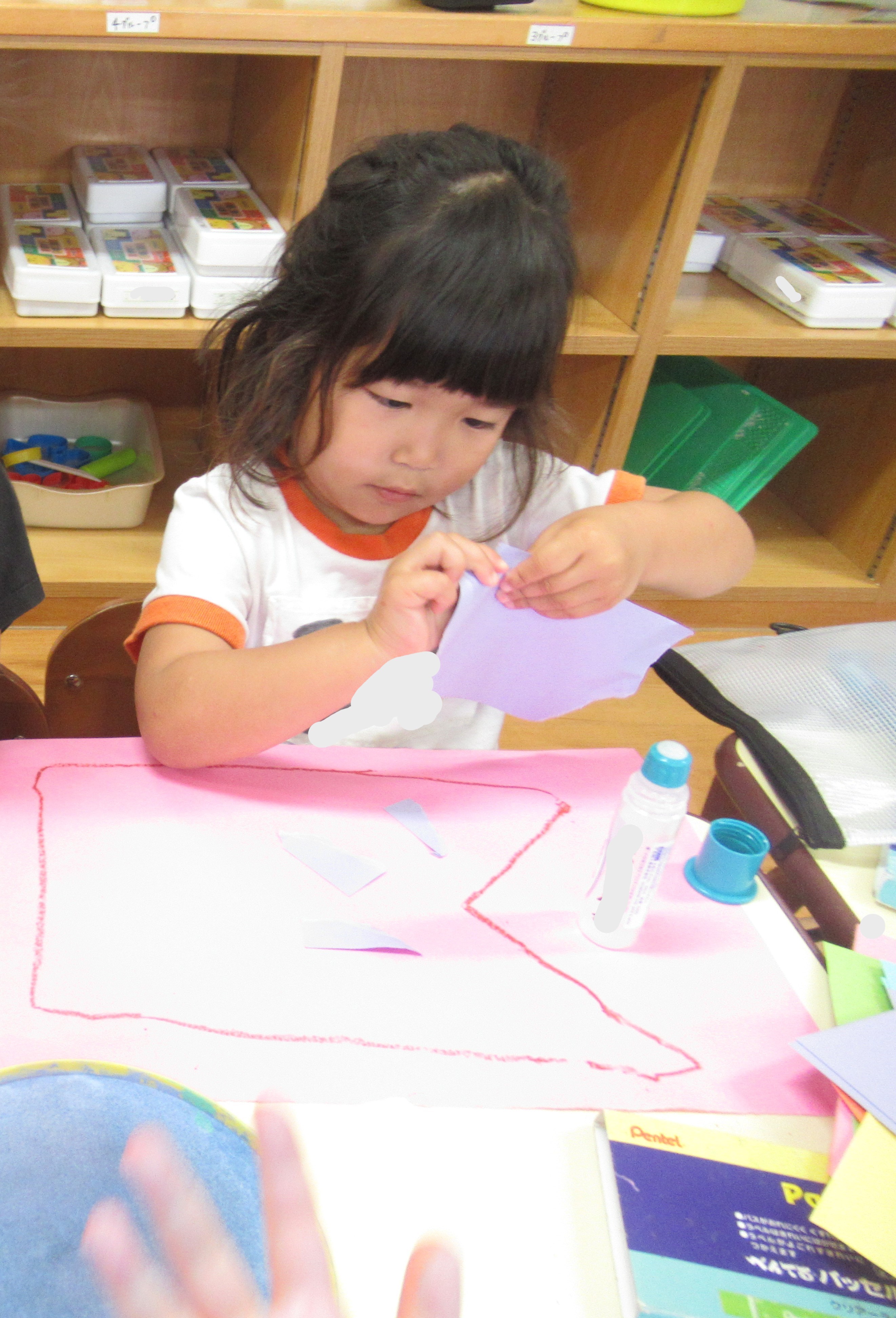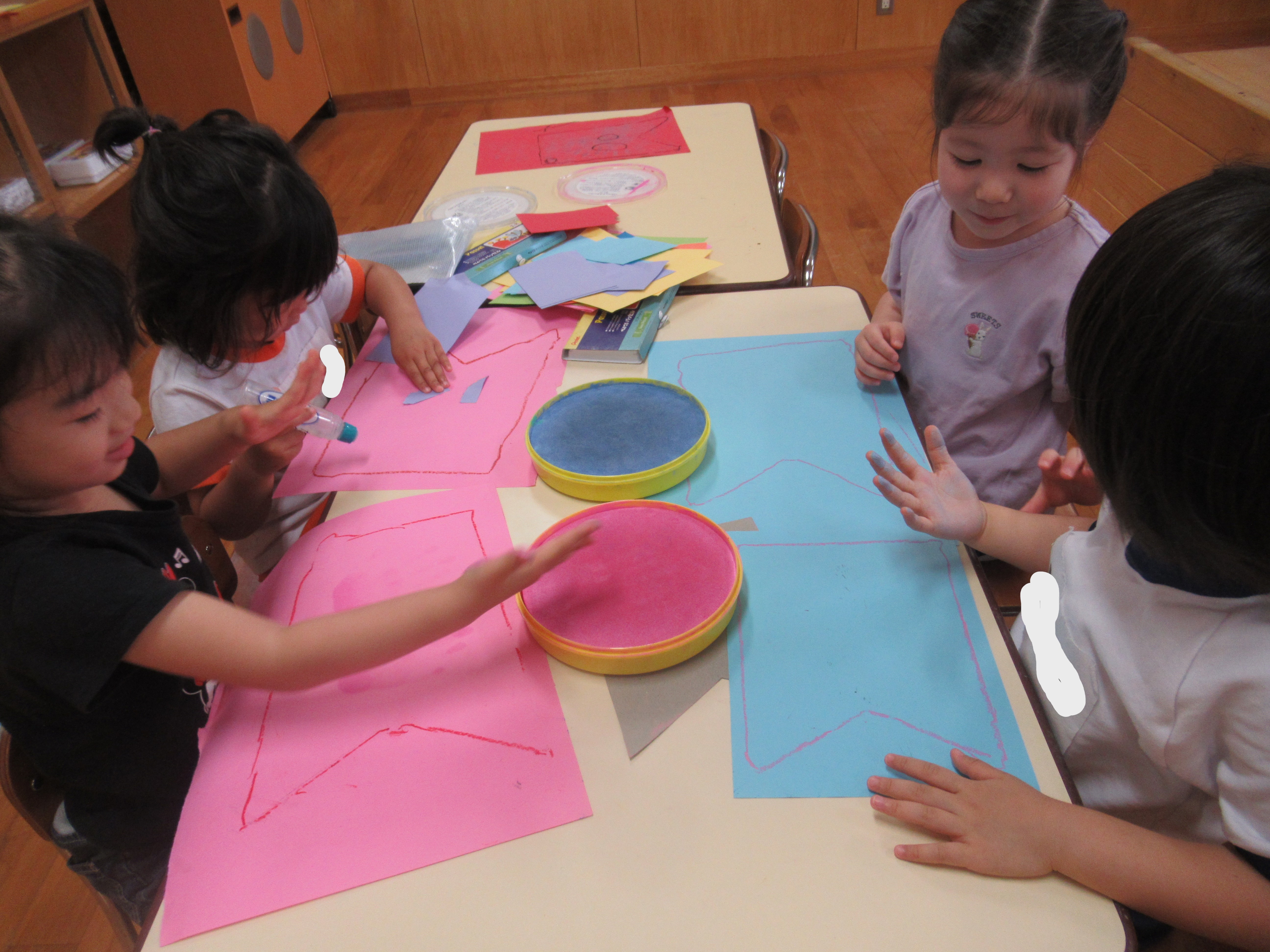 今日は、お部屋遊びでおままごとやお絵描き等自分の好きな遊びをして楽しんでいました。おままごとでは、自分達で作ったお弁当を食べたり、他のお友だちにあげて一緒に食べる姿が見られました。また七夕制作をしたり、職員が描いた絵に色を塗ったり等きれいに塗っていましたよ~。自分で折り紙で折った物に色を塗ったりもしていました。 そろそろ梅雨も明けるかな~。晴れた時沢山園庭で遊ぼうね。