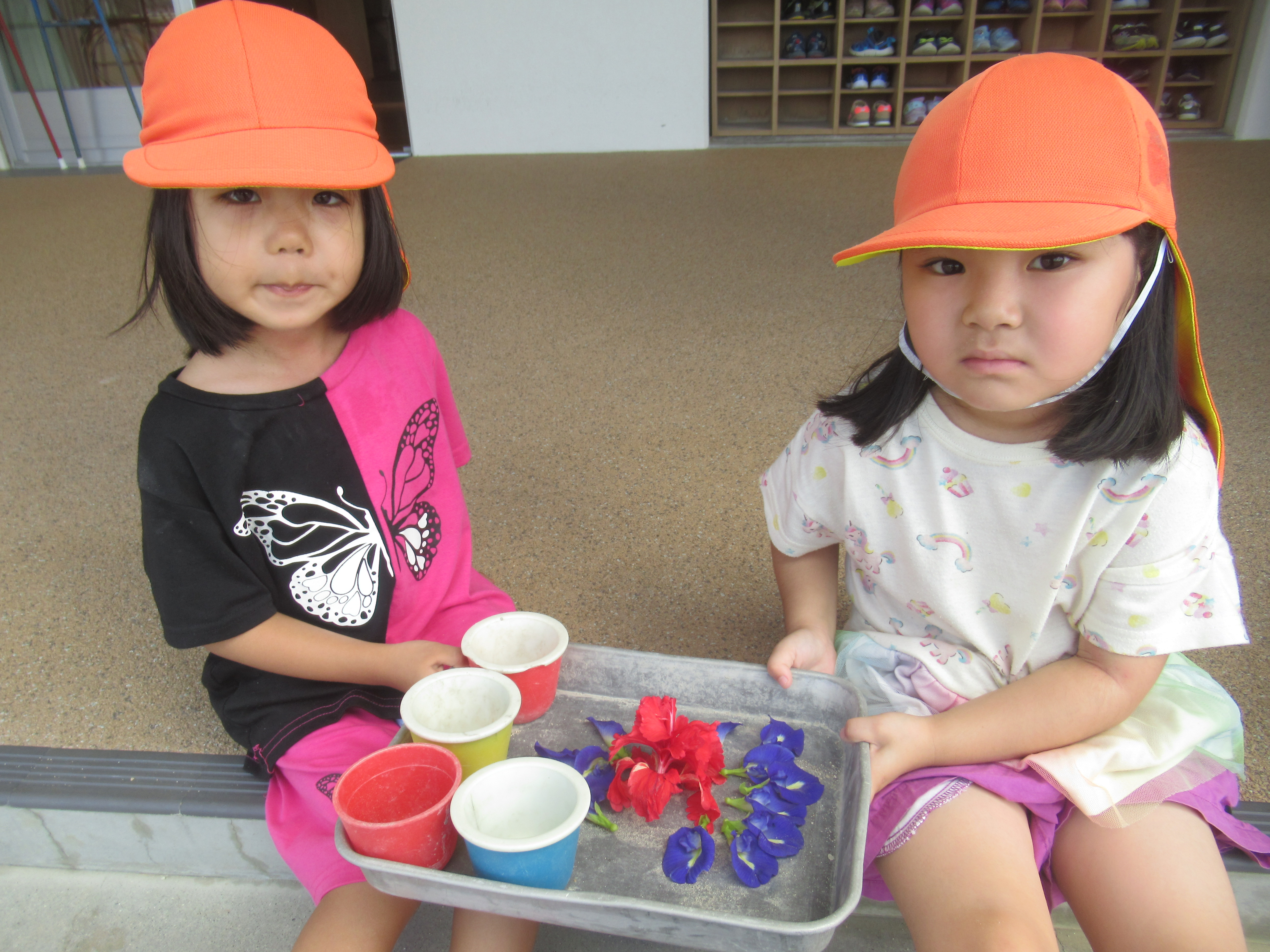 また、お花をきれいに並べてお友達と一緒に色水遊びを楽しんでいました。