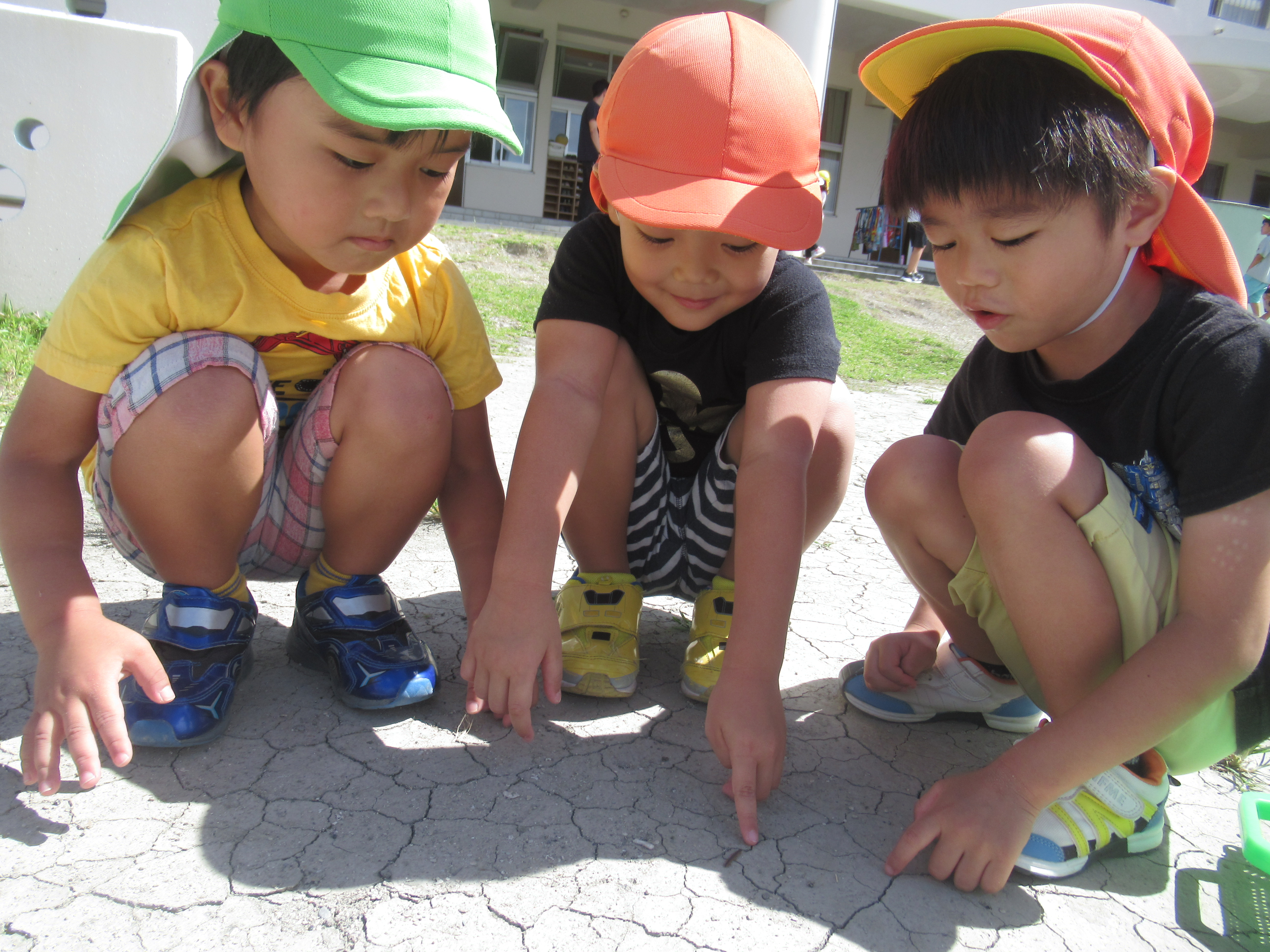 天気もよく、つき組さんは今日も元気いっぱい園庭遊びを楽しんでいました。男の子は最近虫探しに夢中になって、壁と草の間を探し見つけたら、お友達や先生に「ムカデいたよ~」、「かたつむりのからも落ちてる~」など大興奮!!色々な生き物を探して楽しんでいます。また、自分の帽子でちょうちょを捕まえる姿もあり、とても楽しそうに遊んでいます。 女の子は、色水や花を摘んだり、女の子同士でお休みに行ったところ、何をしたよを話して楽しんでいます。「○○に行ったよ~」「行ったことある~」ととても楽しそうに話をしていました。