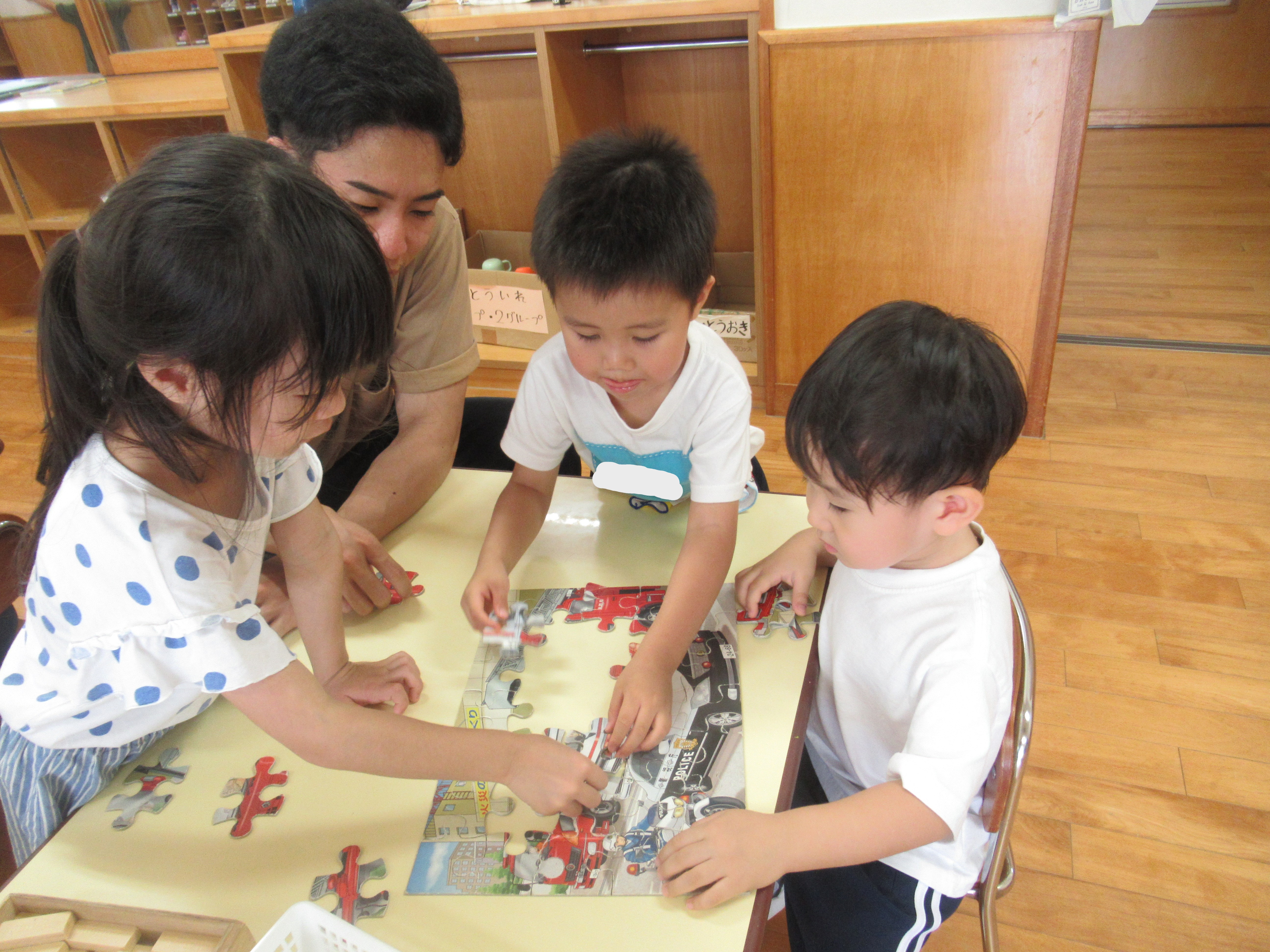 ままごとでは、赤ちゃん人形を使ってご飯をあげたりなど、お家ごっこを楽しんでいます。しっかり膝に座らせてご飯をあげている姿が可愛いですね~。 また、つき組さんは先生の真似をする事が好きで、朝の会で歌っている歌をお友達と一緒にうたったり、1人が先生になり読み聞かせをしています。しっかり言葉も真似をしているので私達職員も見ていてとても楽しいです。