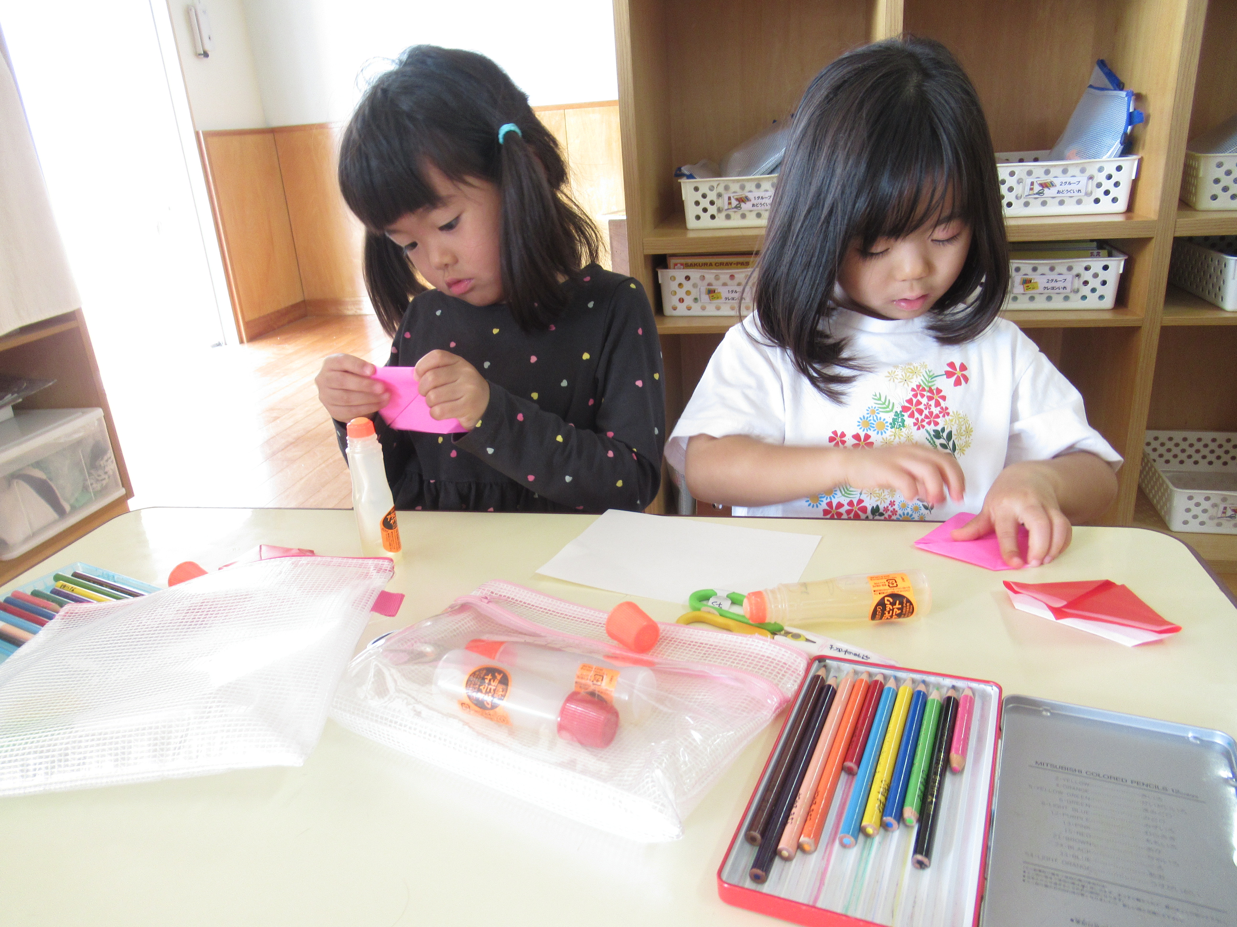 今日は、折り紙でサンタさんを作りました。先生をお手本に真似して折ったり、友達同士で教え合いながら作る姿もありました。しっかり角を合わせ、顔も書いていきます。サンタさんの服をデザインしたりと、子ども達思い思いの作品が出来上がりましたよ♬クリスマスまだかな~と楽しみにしているつき組さんです♪