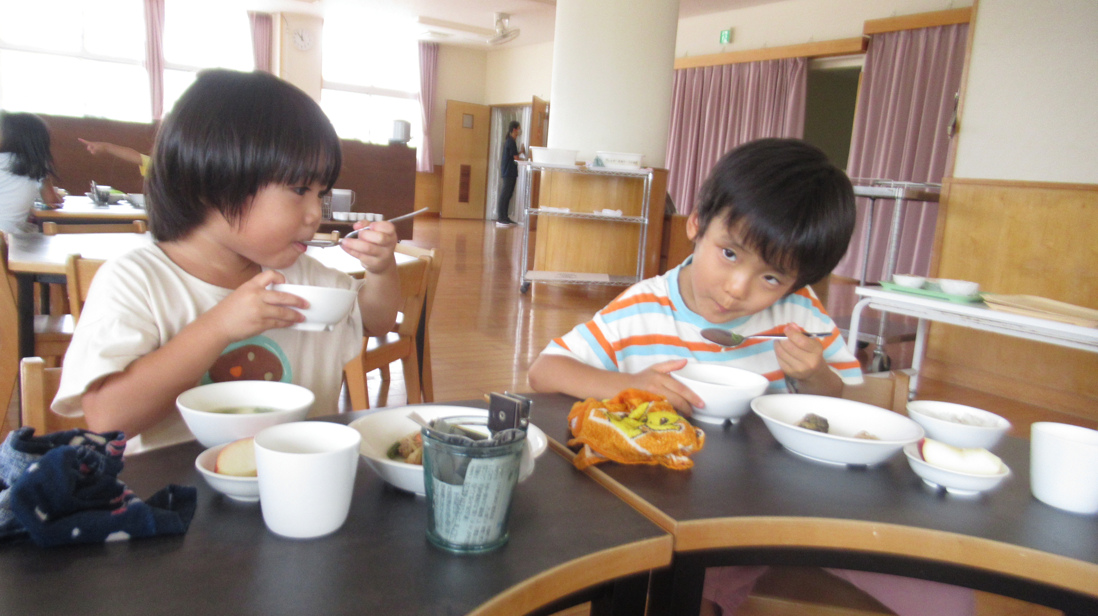 今日の献立はご飯・鮭・筑前煮・そうめん汁。最近は完食して沢山食べる子も増えてきましたよ♪苦手な食材も少量ずつ挑戦する姿も見れます。