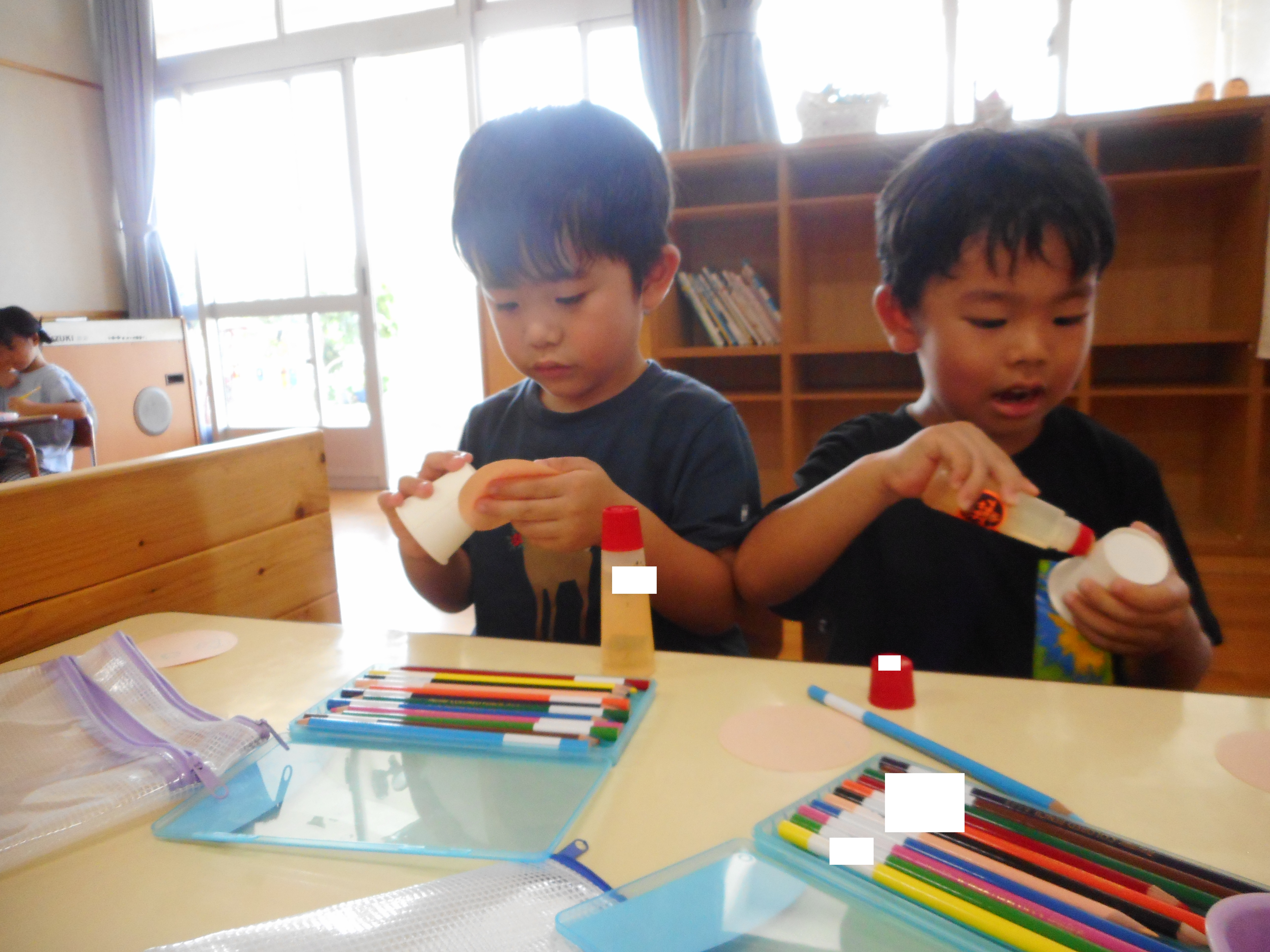 七夕の制作活動のを行いました♪最初に織姫と彦星の顔を描いて、自由に体・服を作ります。折り紙や画用紙、紙コップ、紙皿等子ども達の思いのまま組み合わせていきます!ハサミやノリの使い方も上手になり切ったり貼ったりと楽しそうな様子がありました。その後はお部屋遊びを楽しみましたよ♪