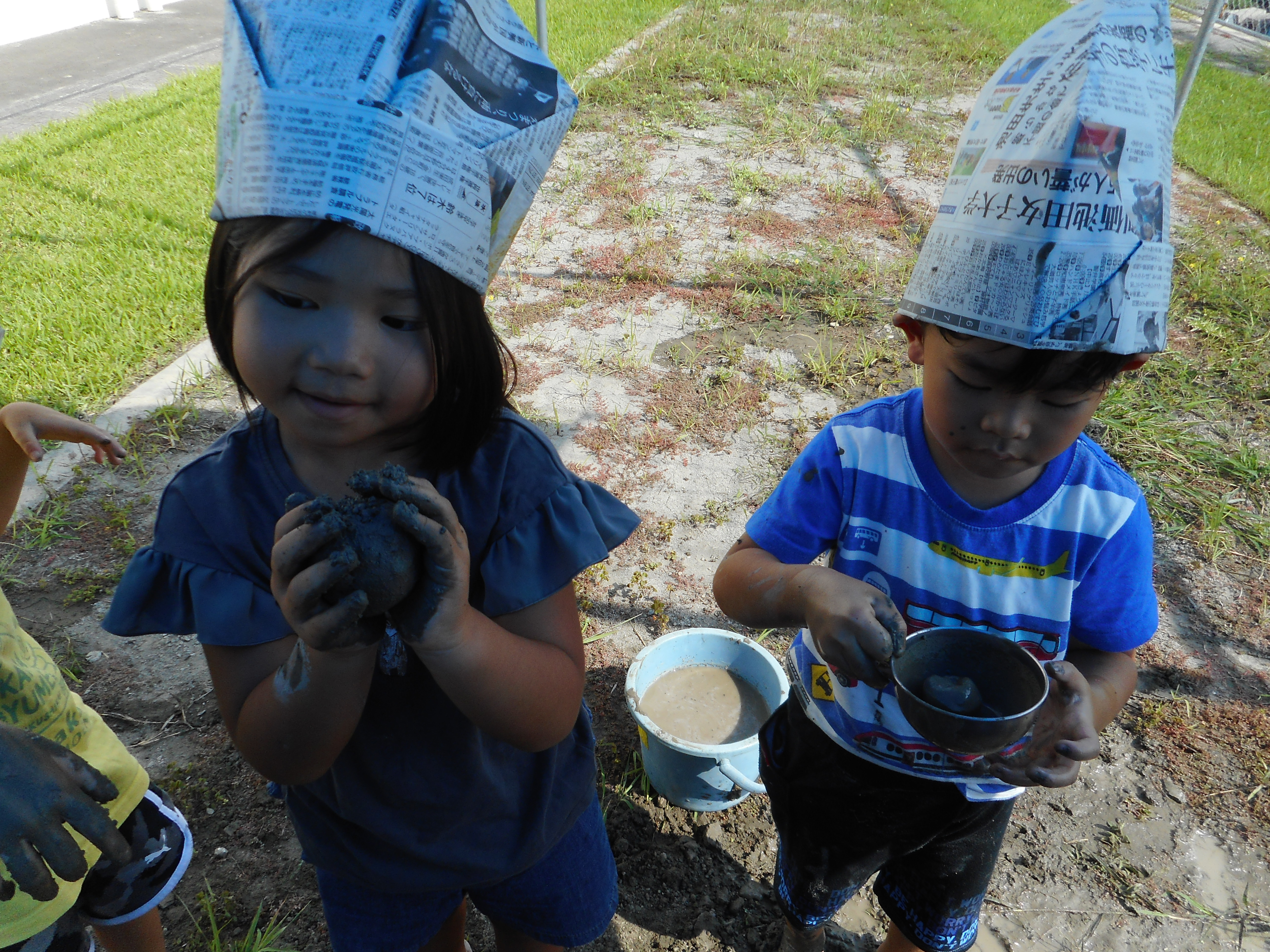 友達同士で「おばけになろ~よ!」「手に全部泥をぬってみよう」など会話し時間を忘れくらいとても楽しそうに遊ぶ子どもたちでした☆