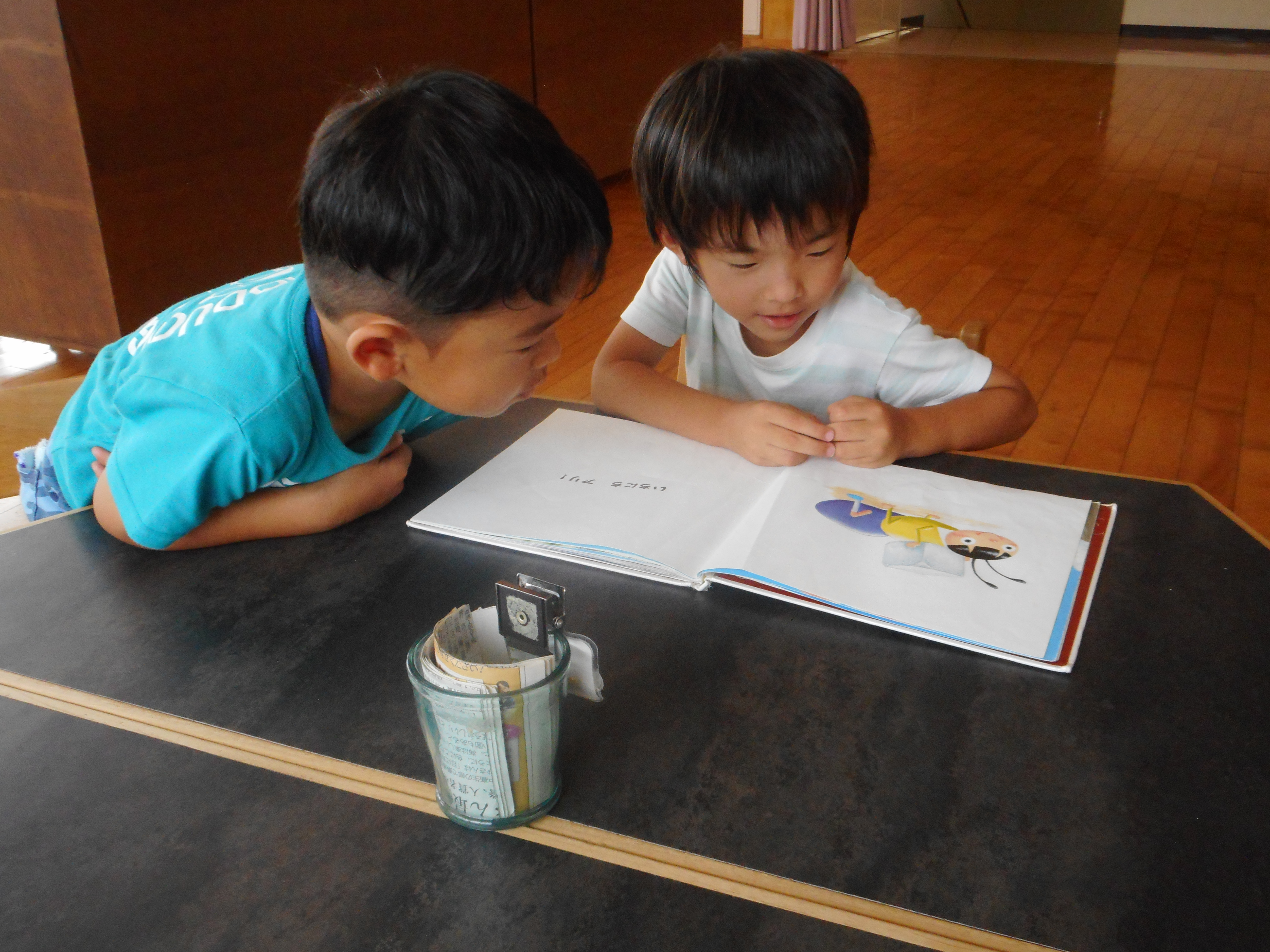 室内では、最近自分たちで絵本を読む子が増えてきています。これは、「あ」「い」だよとひらがなに興味を持って話す子が増えてきています♪