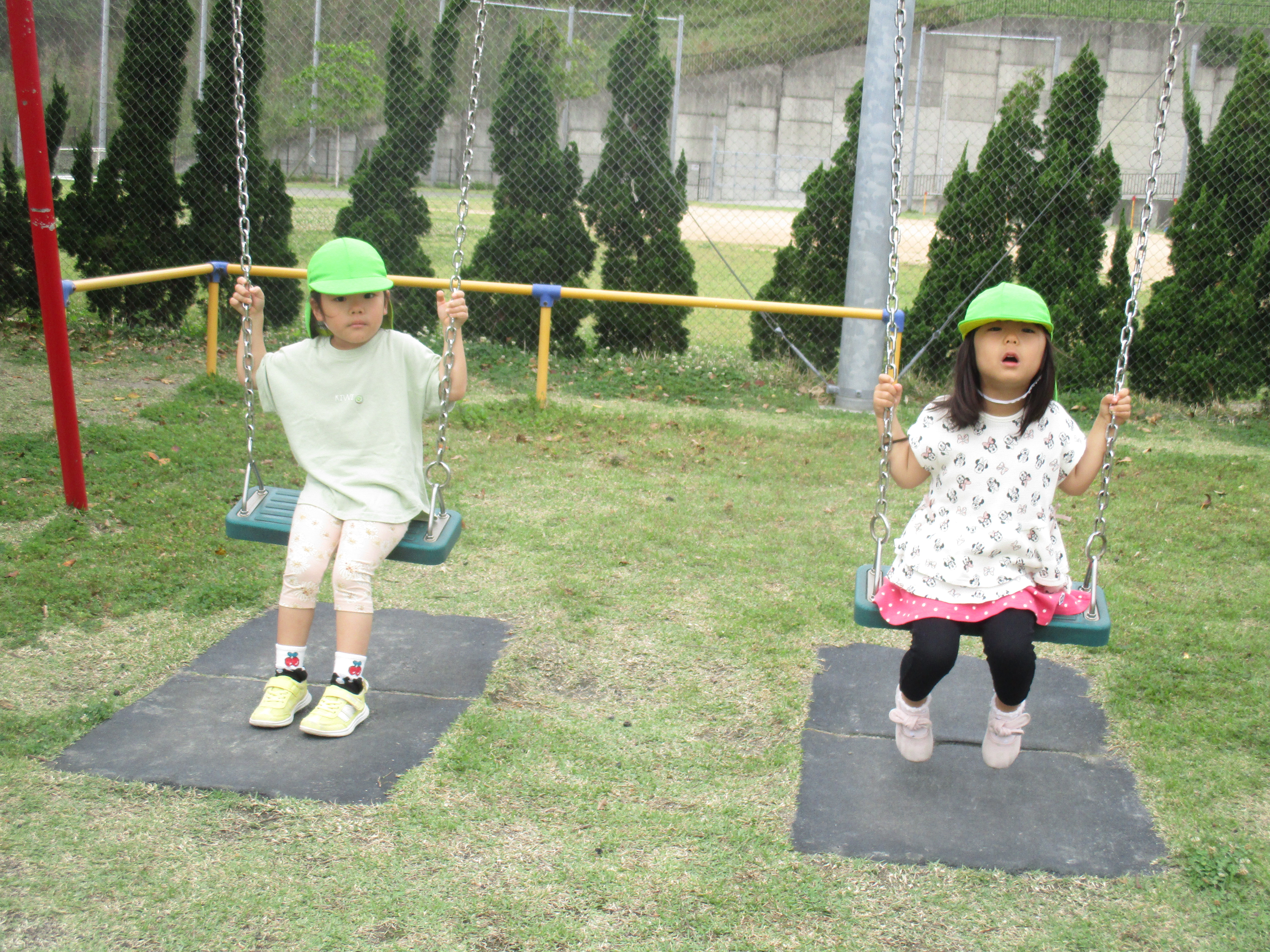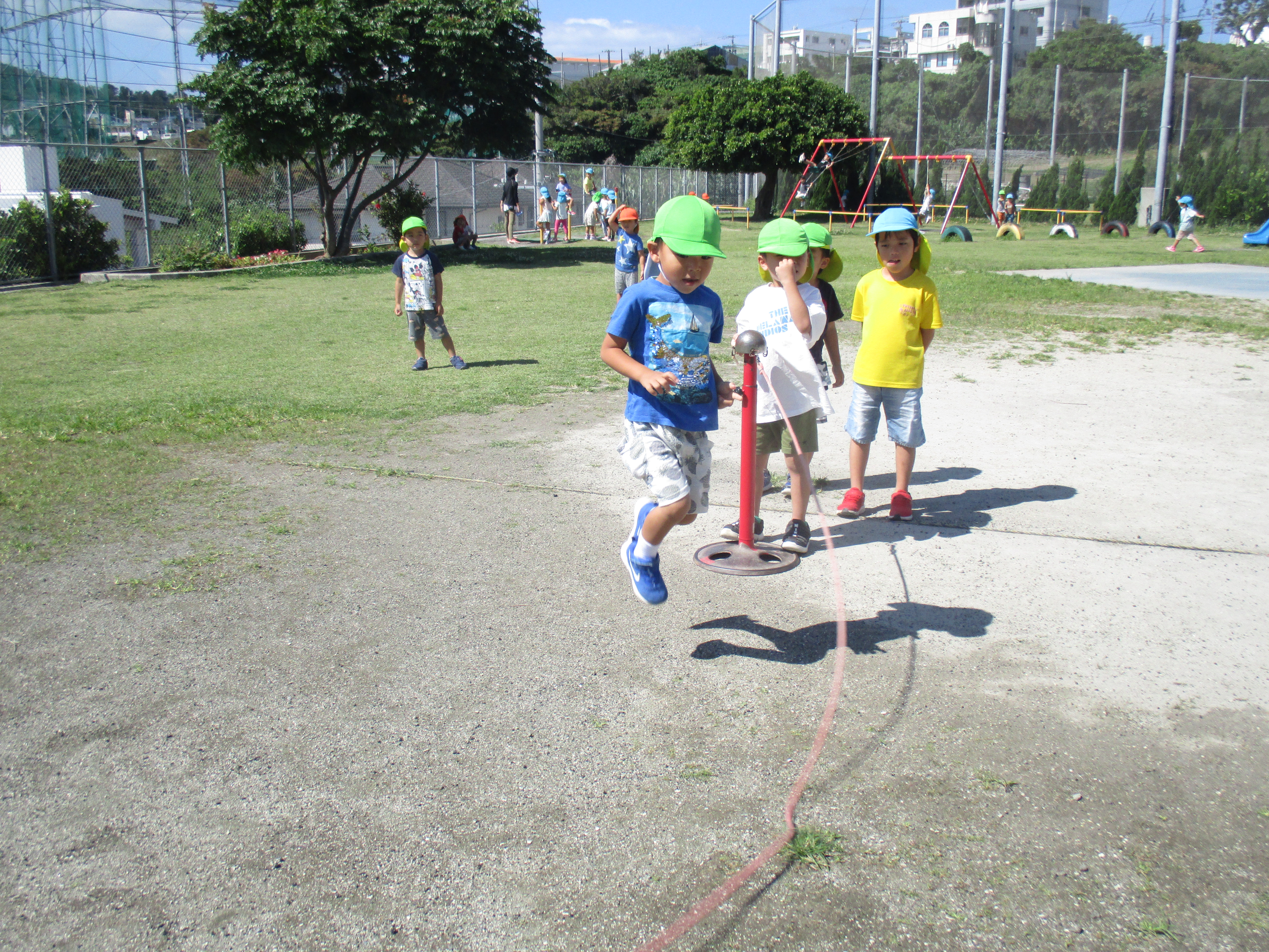 今日は園庭遊びでブランコ・鉄棒・短縄跳び等自分が好きな遊びを楽しんでいるつきぐみさん!最近は、自分の好きな遊びを決めお友達を誘ったり、保育教諭と一緒に体を動かしています!短縄では「せんせ~い!見て20回跳べたよ~」や「鉄棒上手にぶら下がれるよ」と一生懸命頑張っています♪