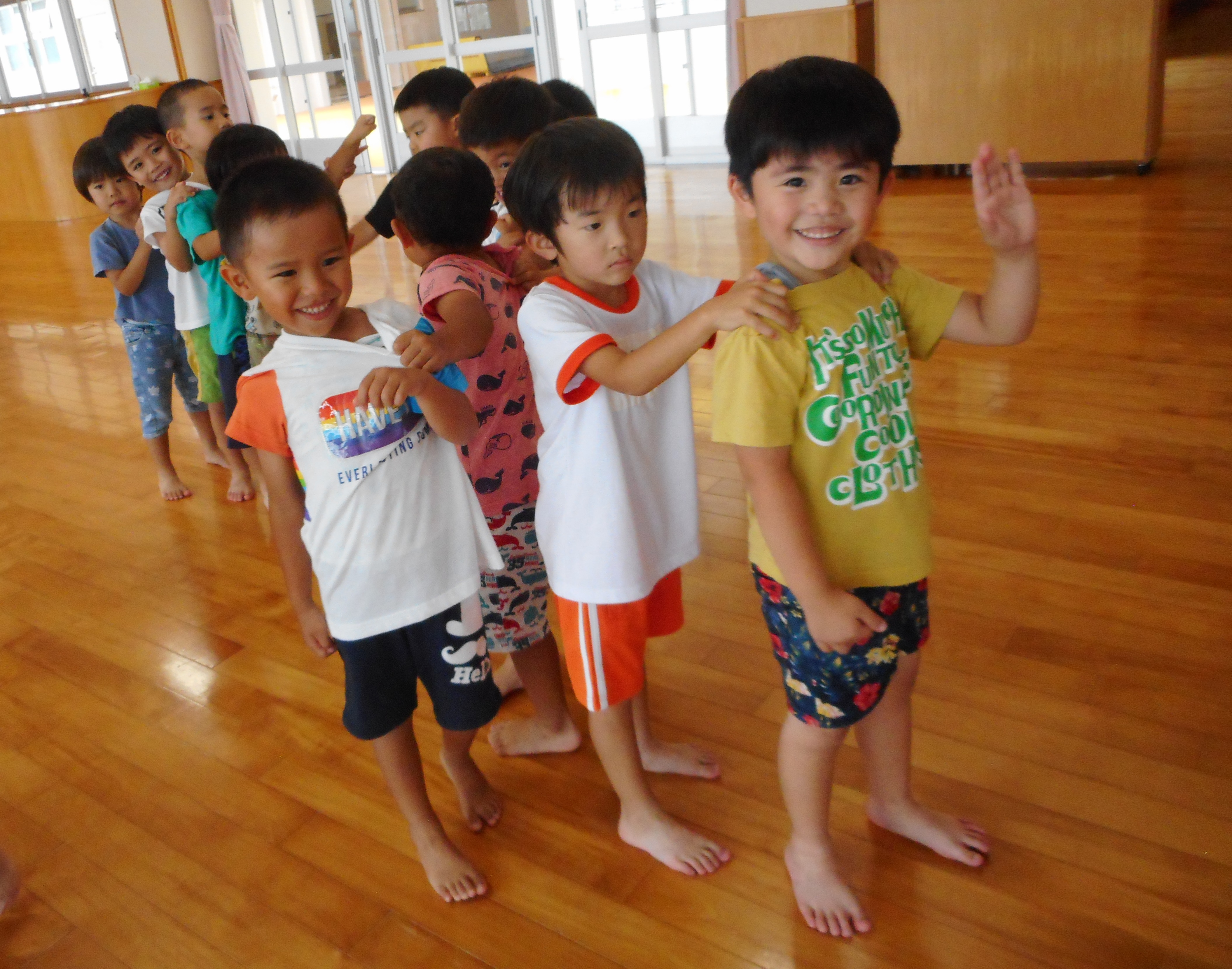 今日は遊戯室で「じゃんけん列車」を行いました。音楽に合わせてお友達と一緒に列車になり、音楽止まったらお友達と「ジャンケン ポンッ」とジャンケンを楽しむ姿が見られました。