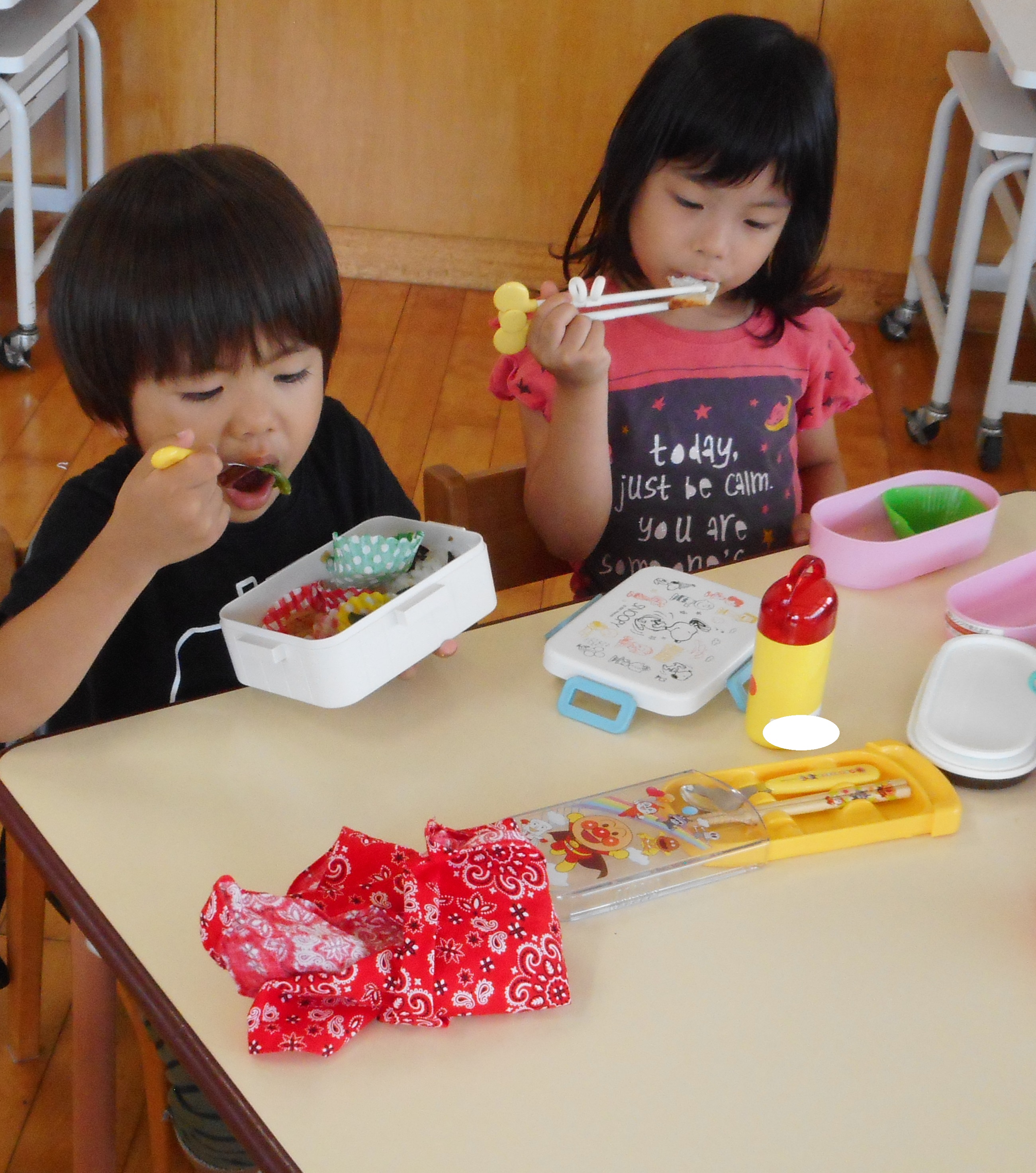 今日のお弁当「たまごやき」「ウィンナー」が入っていてお友達と一緒だね等会話を楽しみながら美味しく食べていました♪