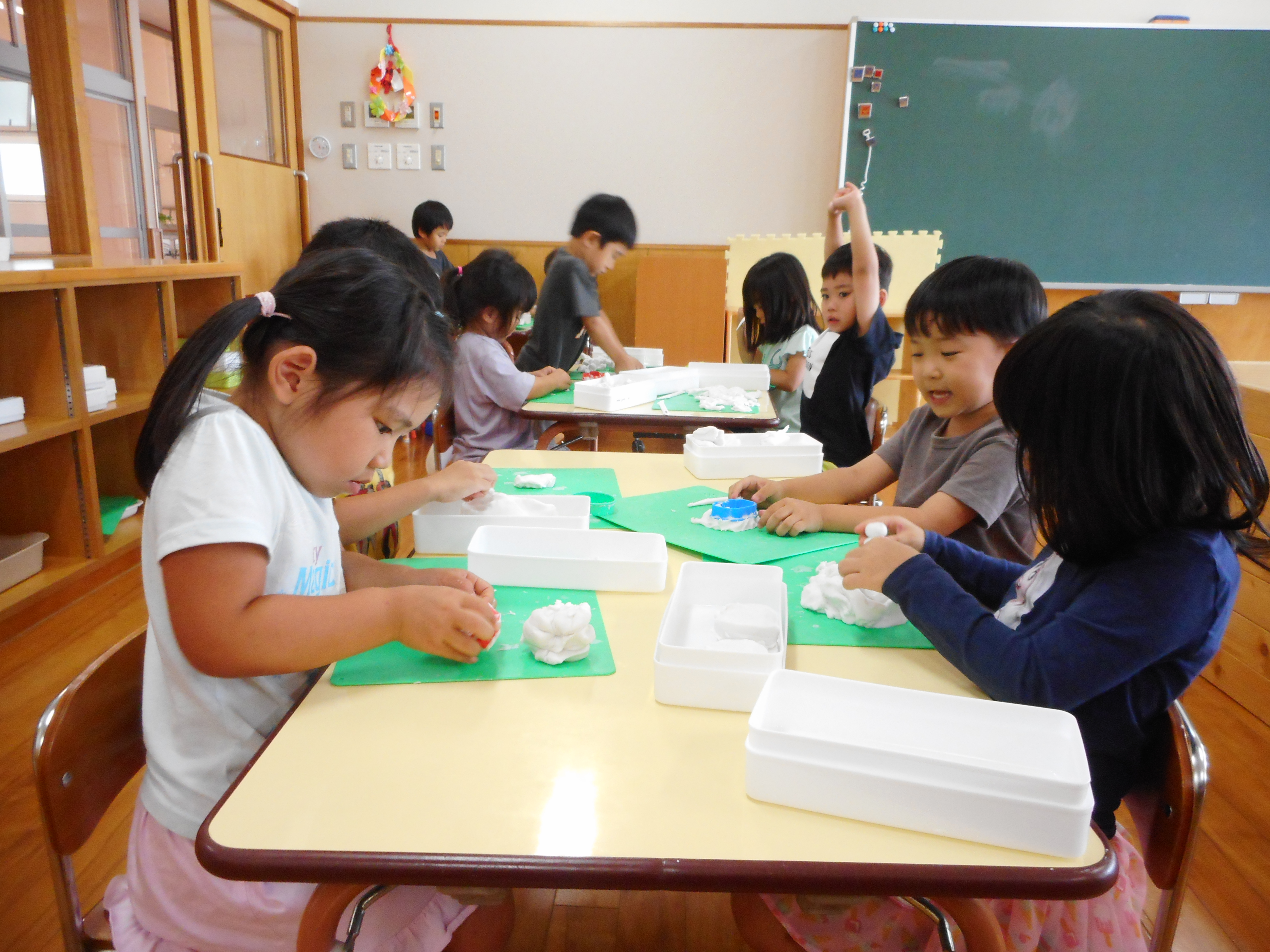 粘土遊びでは、チーズやマシュマロ、ライオン等表現力、想像力豊かな様々な作品が出来上がっていました♪園庭では、虫探しや砂場でのケーキ作り、夢中になって遊んでいましたよ~! 今日の英語は音楽に合わせて手遊びやダンスをしました♪♪