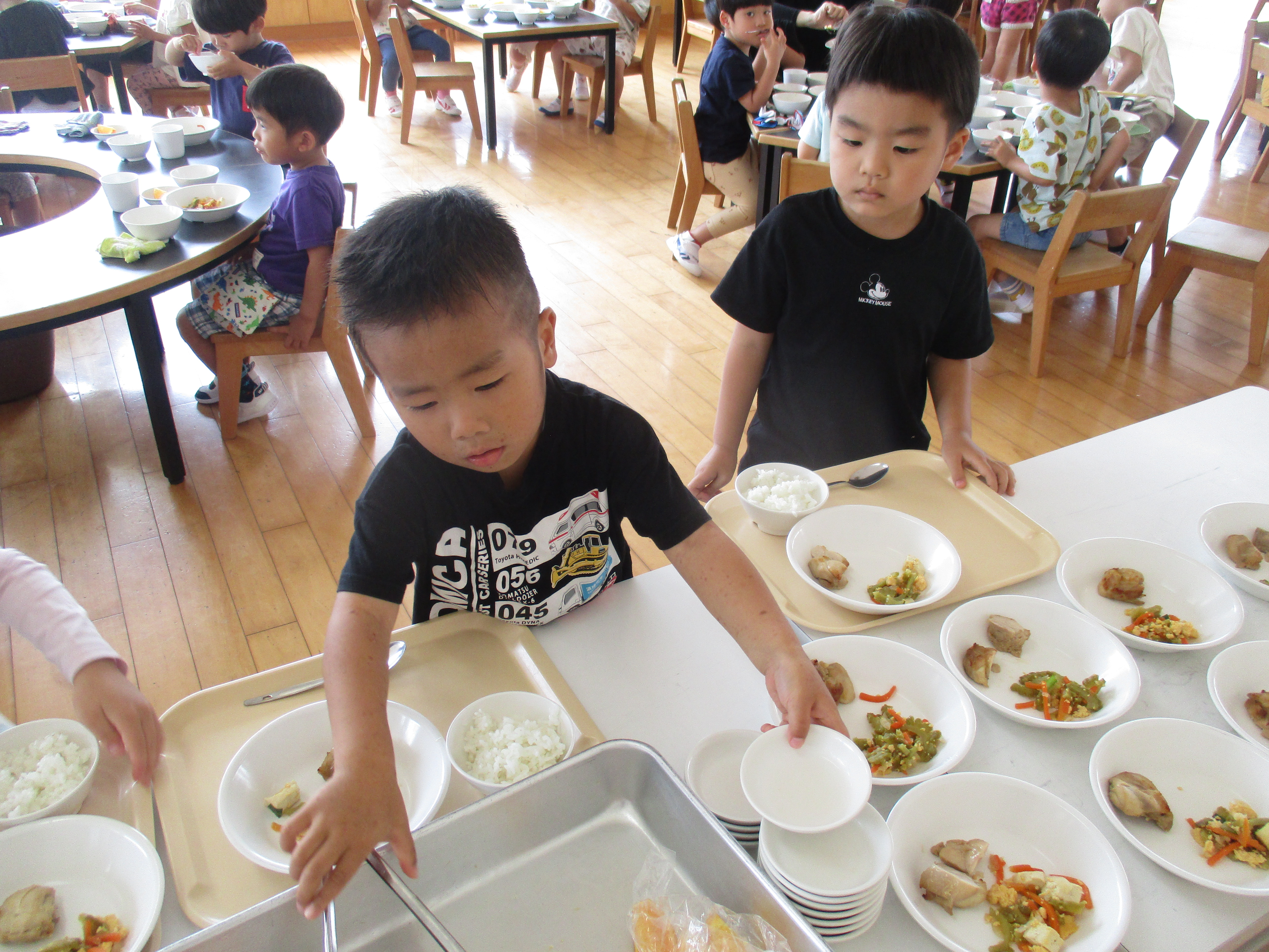 最近では、トングでデザートを上手に取る事やトレーを両手でしっかり持って自分の席まで上手に運べるようになってきた子ども達!