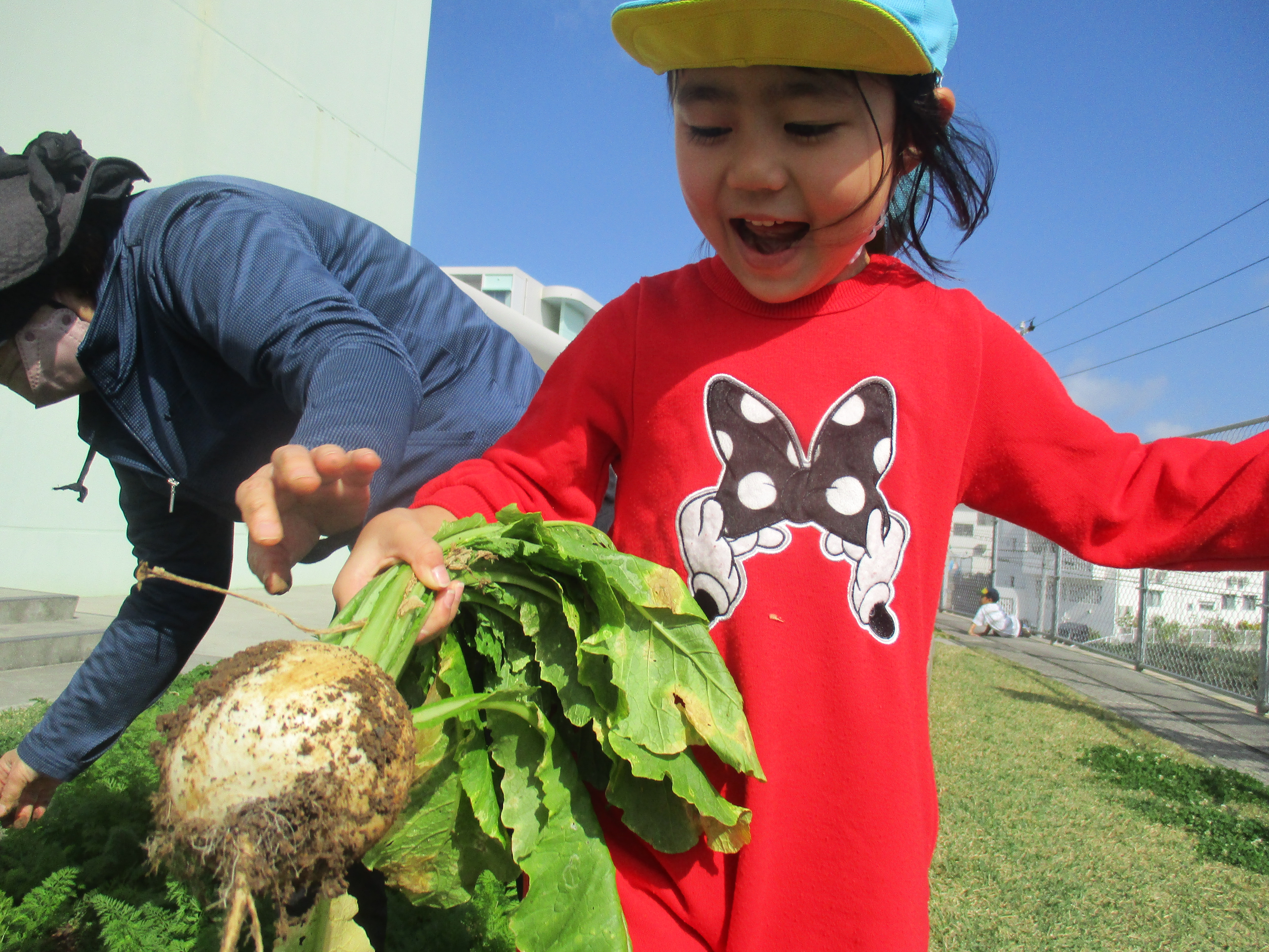 つき組さんが育てていた、ブロッコリーとカブが収穫の時期を迎えました。ブロッコリーは包丁で根元から切るところを見て、カブは子ども達の出番!「小さいカブ取れた」「こっちのは大きいー!」と会話を楽しみながら収穫していましたよ。