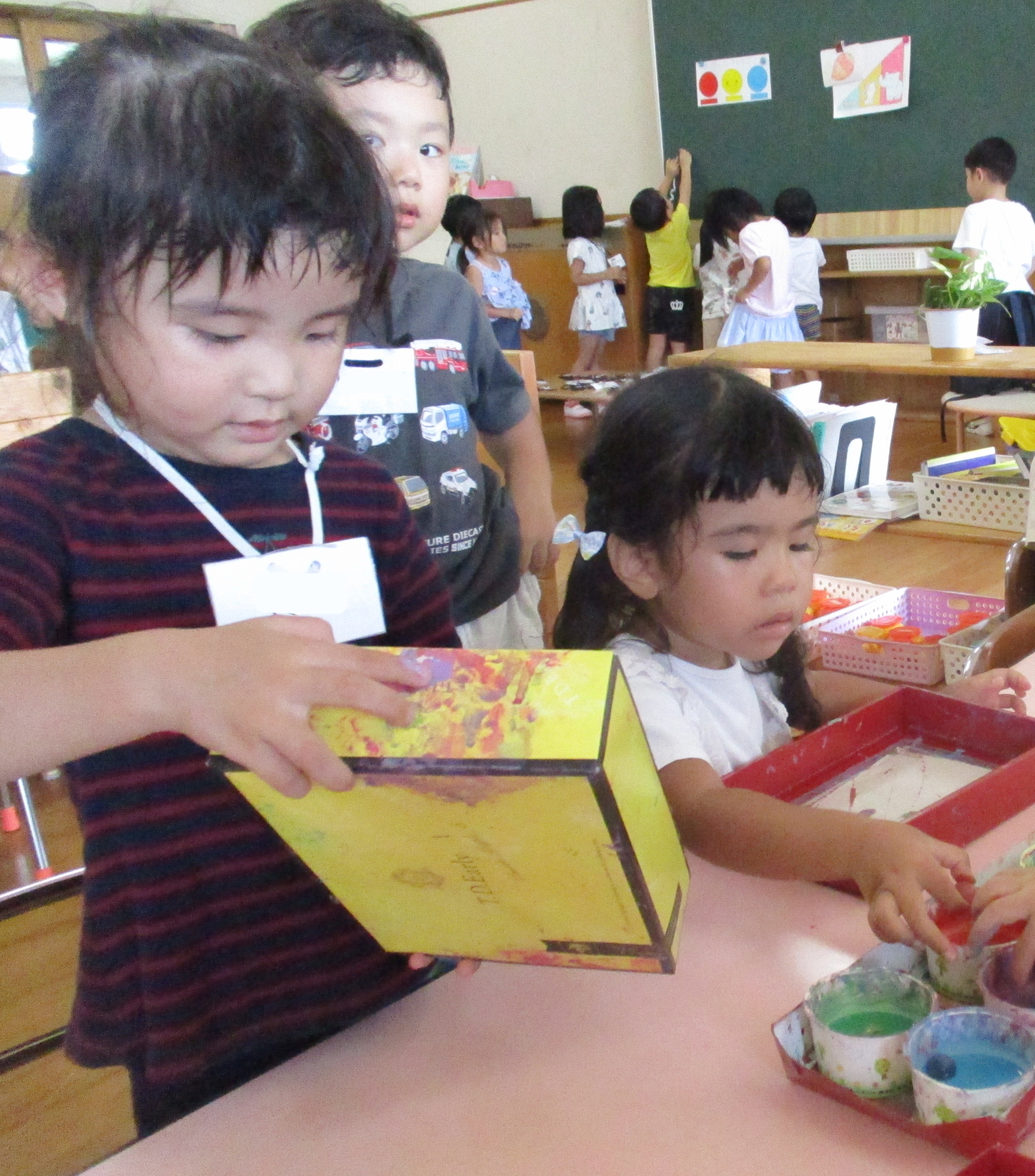 「ポンポンッ」と、力の加減をしながら優しい色を作る子どもたち。「青と赤でむらさき色になった!」「ピンクもやってみる!」など、上から色を重ねるとできるマーブル模様や色の変化にワクワクしていました。