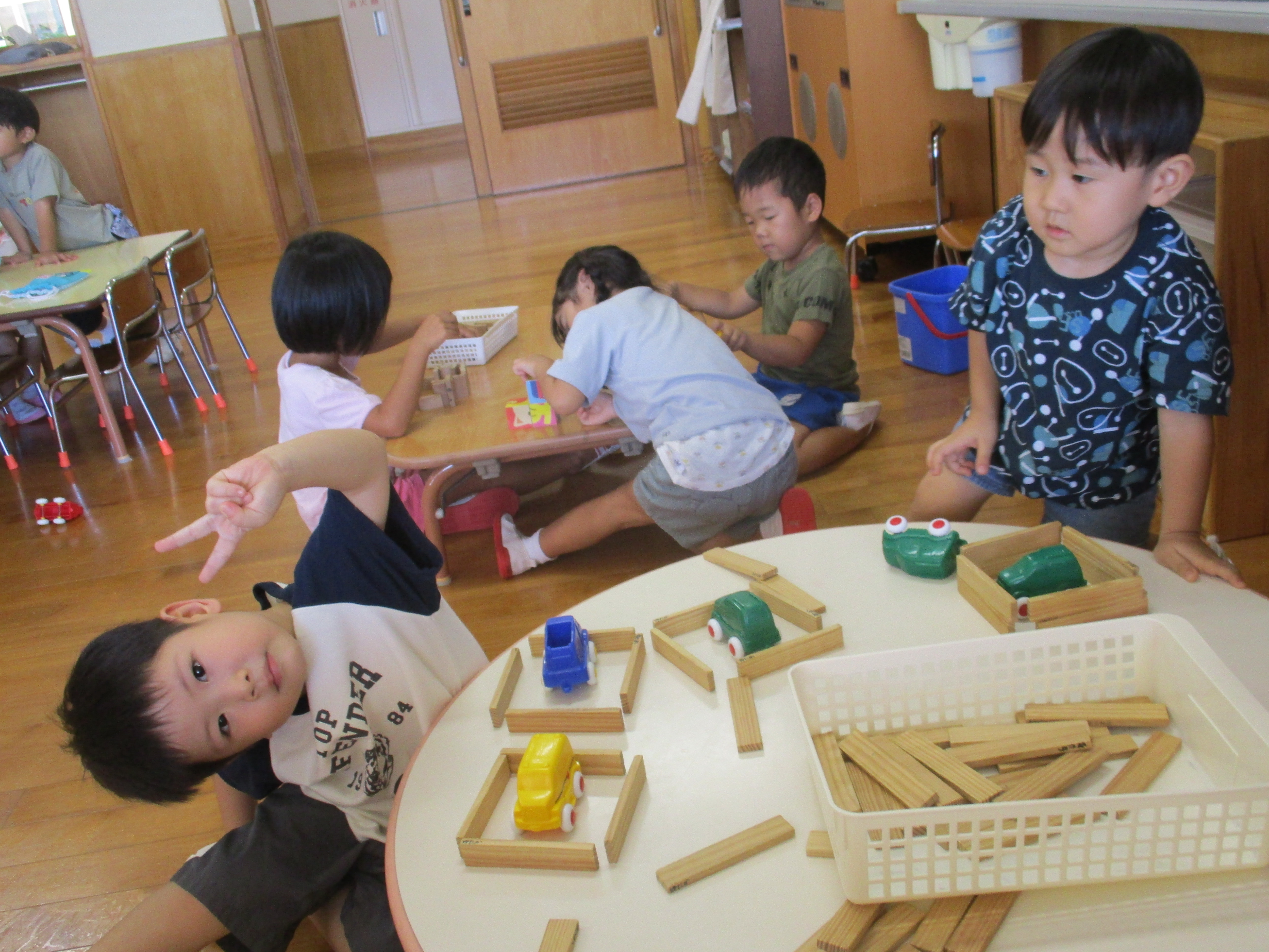 今日は2階のコーナーのお部屋でみんなでダンスタイムをしました。お誕生日会の時に踊ったアロハ・エ・コモ・マイのダンスと、運動会の準備体操、去年踊ったゾンビダンスを踊りました。運動会の準備体操は、始めたばかりで子どもたちも少し自信がなさそうな表情でしたが、一度見本を見せると楽しそうに先生の真似をして踊っていましたよ~。アロハ・エ・コモ・マイとゾンビダンスは、何度も踊ったことがあるので自信満々で笑顔で踊っている様子が見られました。とても可愛らしいつき組さんでした。その後は、コーナーのお部屋でカプラをしたり、ワミーを身につけたりして楽しんでいました。雨の日は、沢山体を動かしたり、ダンスしたりして楽しもうね~。