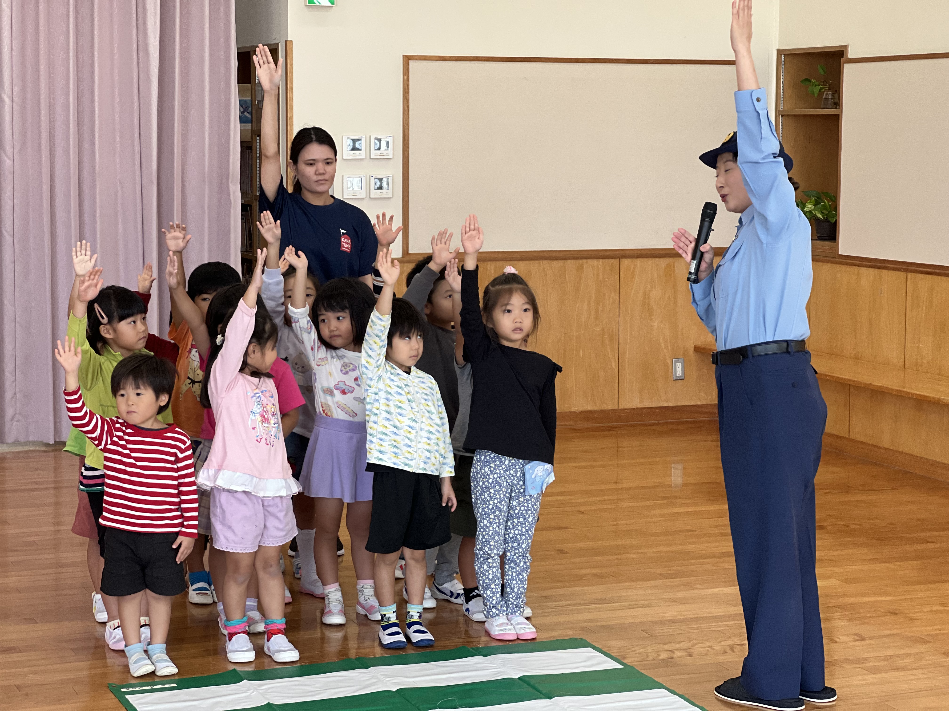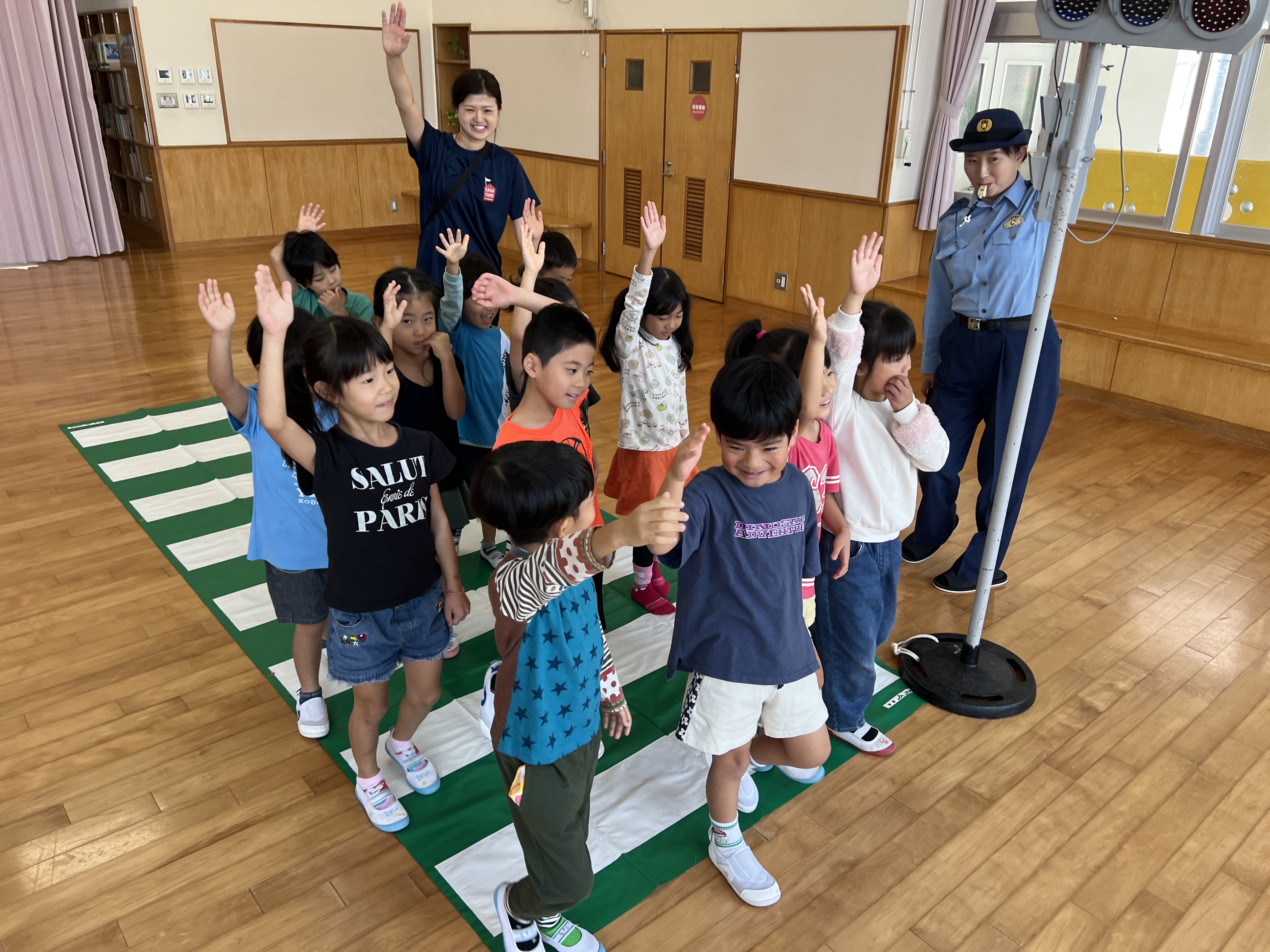「右見て 左見て 右を見て・・・」横断歩道を手をあげて渡りましょう!!と警察官から話を聞いたお友だち。信号機を見ながら元気よくお友だちと一緒に横断歩道を渡る練習をしましたよ。