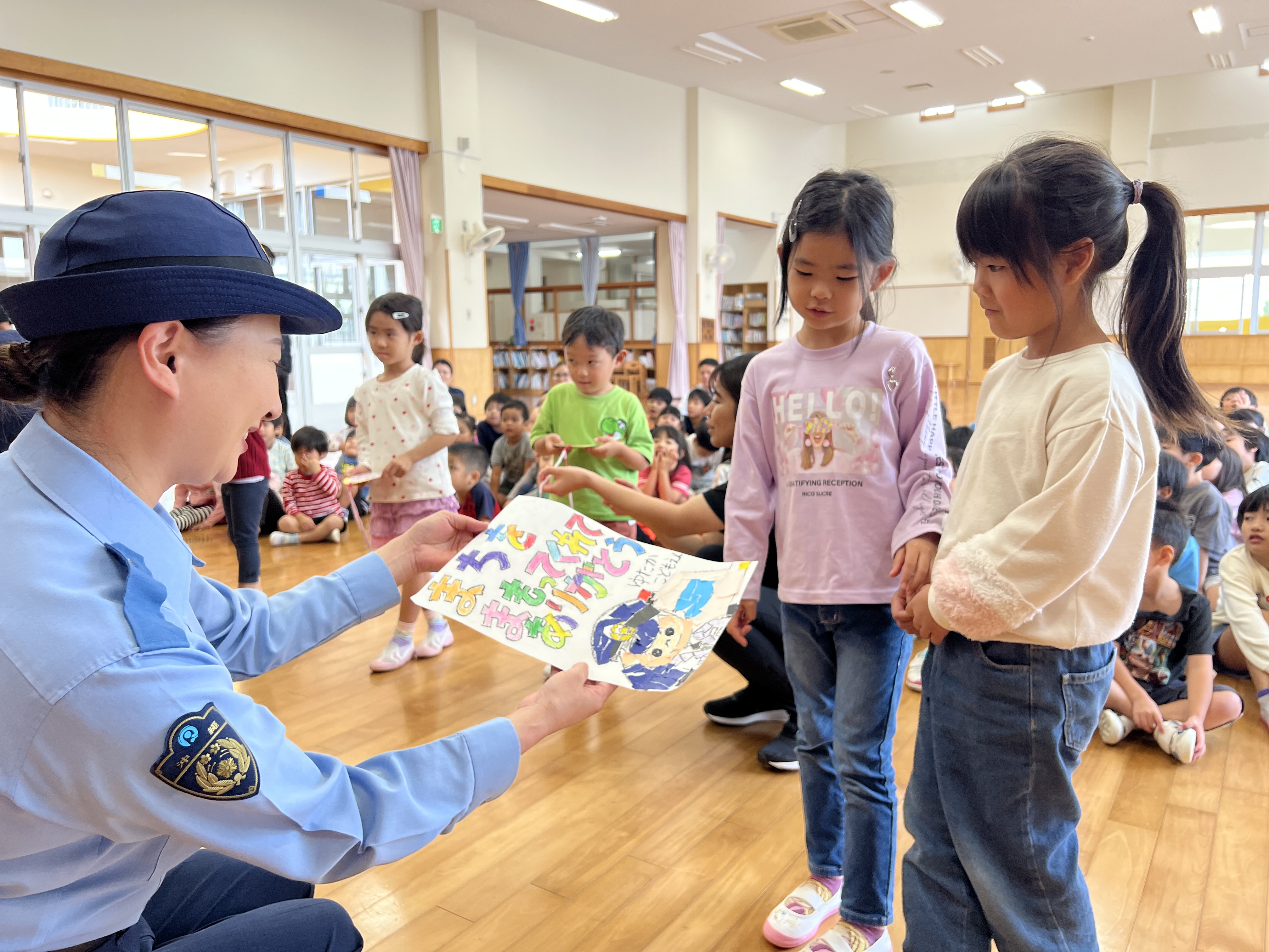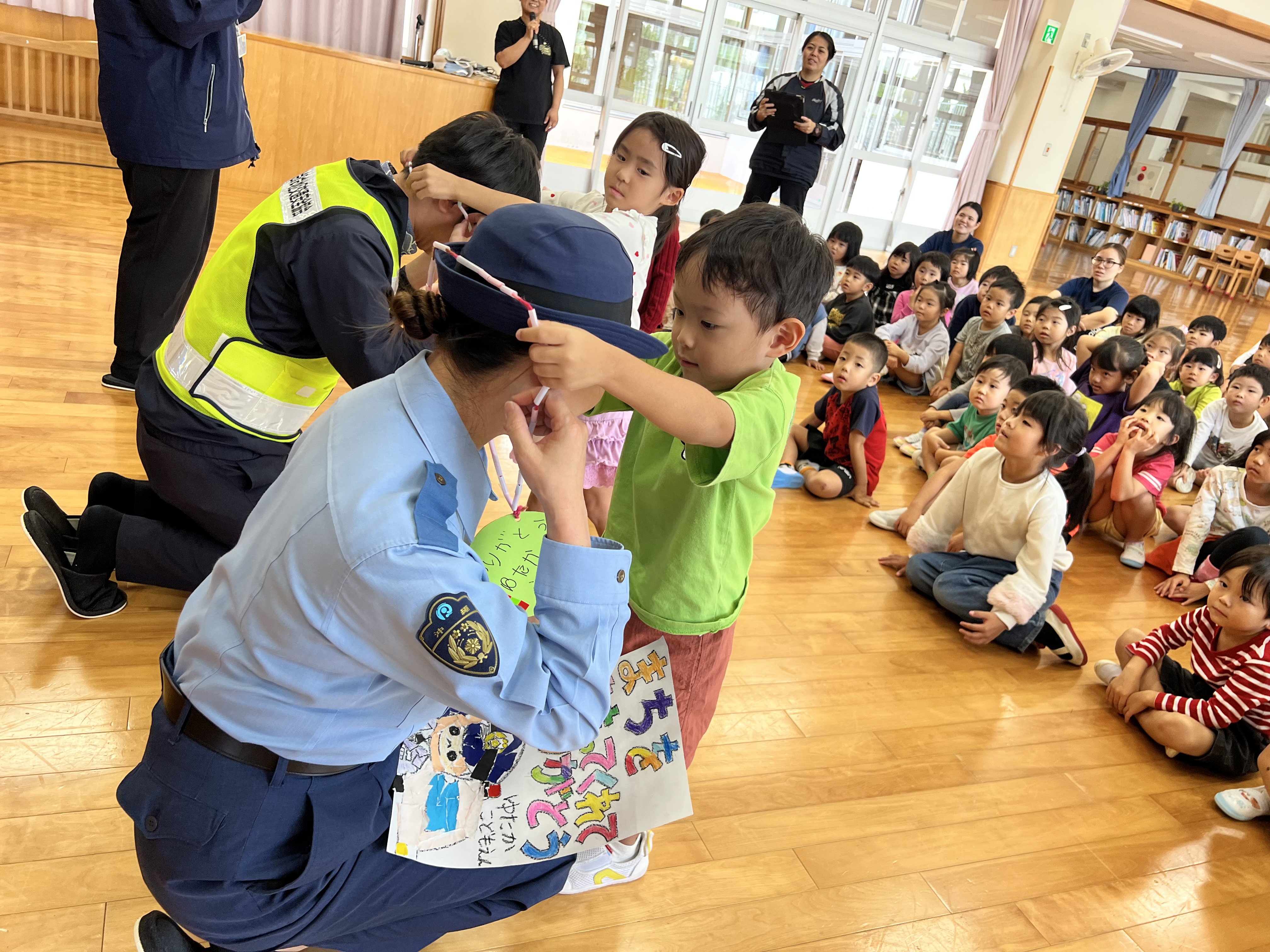最後に警察官の方から「信号は青になったら手をあげてわたる」「駐車場では遊ばない」「交通安全を守って自分の命を大切にする」の約束を守って下さいというお話を真剣に聞いていましたよ。