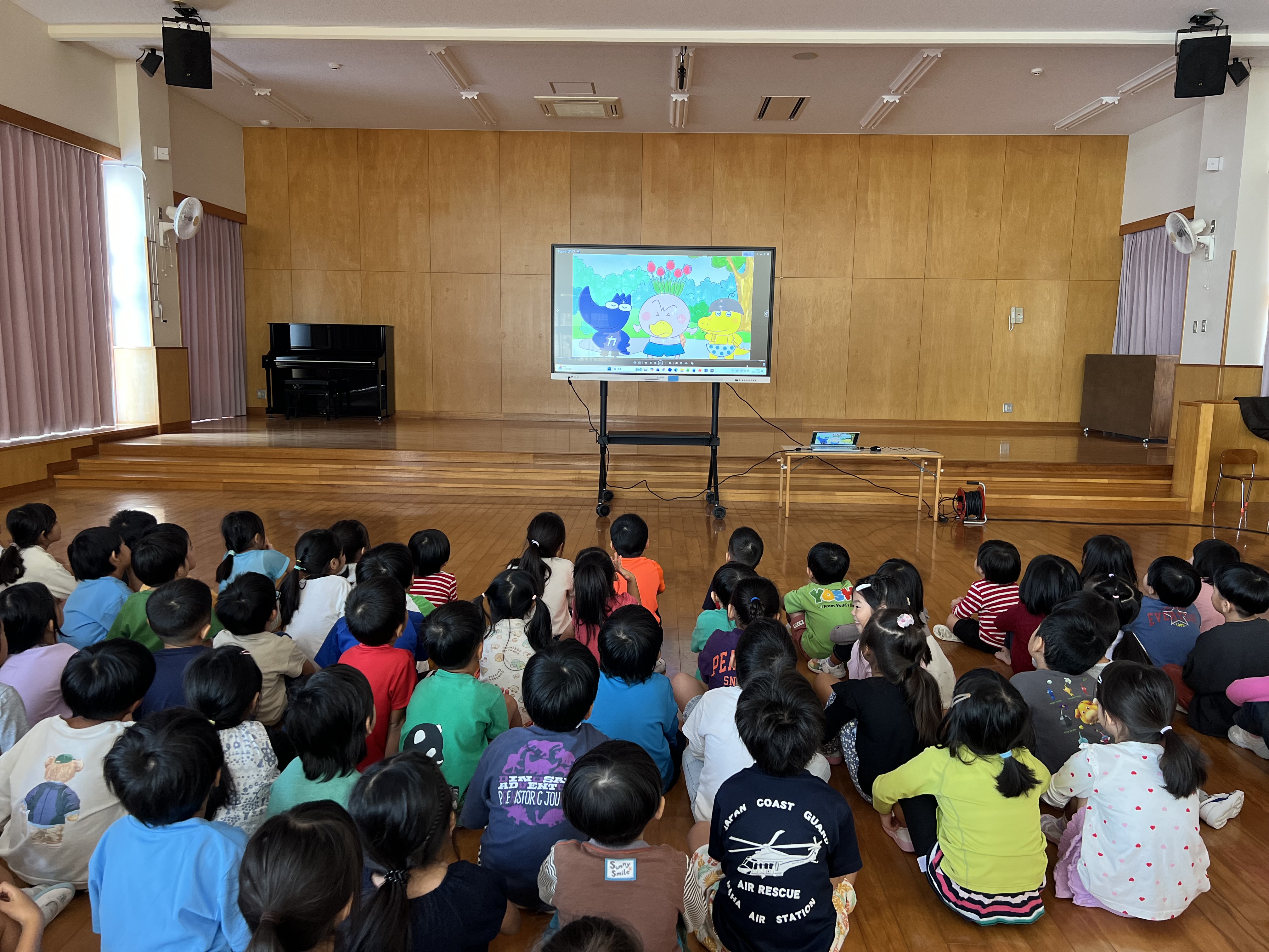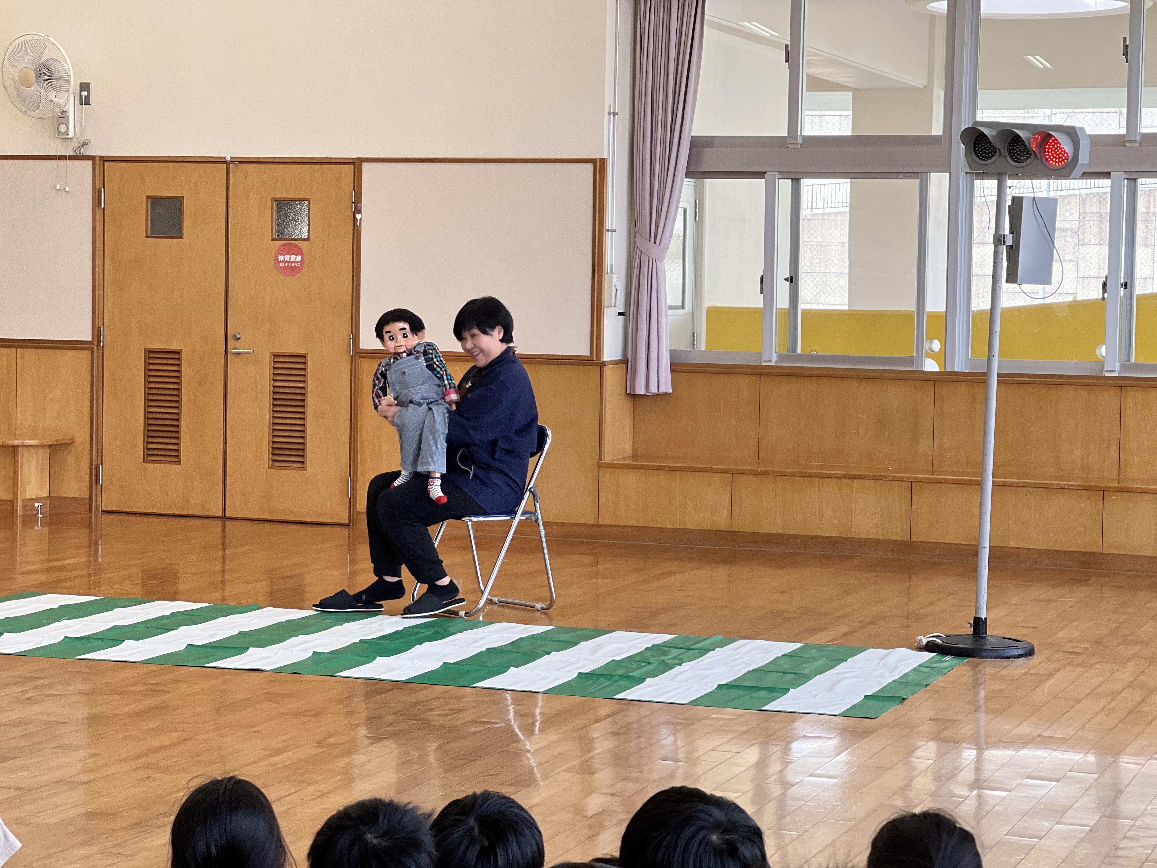 横断歩道の練習のあとは腹話術のけんちゃんのお話とDVDを見て交通安全の大切さを学びました。